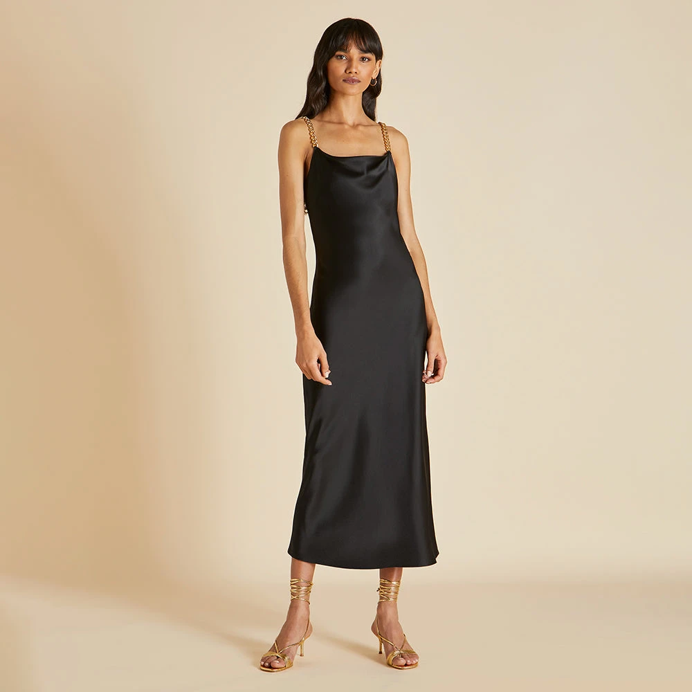 Turn heads in the Bibi jet black silk satin slip dress – sleek, sensual, and effortlessly elegant. The luxurious silk drapes beautifully, enhancing every curve while offering comfort and confidence. Perfect for evening events or anytime you want to feel unforgettable.