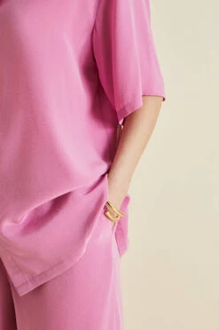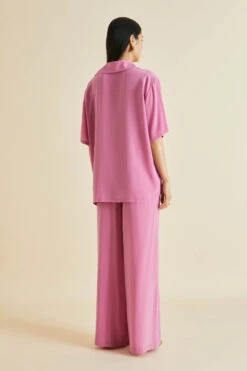 This season, welcome the Alabama. An easy, breezy silk crêpe de Chine set with palazzo trousers and short sleeves, she’s relaxed and ready for whatever the day may bring. The branded label on her waistband offers a vintage American sportswear inflected note, equally fit for work, play, and dedicated lounging.