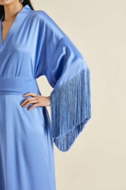 In the 1920s and 30s a bohemian generation of creatives sought the dazzle of sun and sea on the French Riviera. The Amina Bluebell robe invokes a similarly spirited sense of libertine pleasure, embodied in enticing sky blue 19-momme silk and a thrilling cascade of fringed trim.