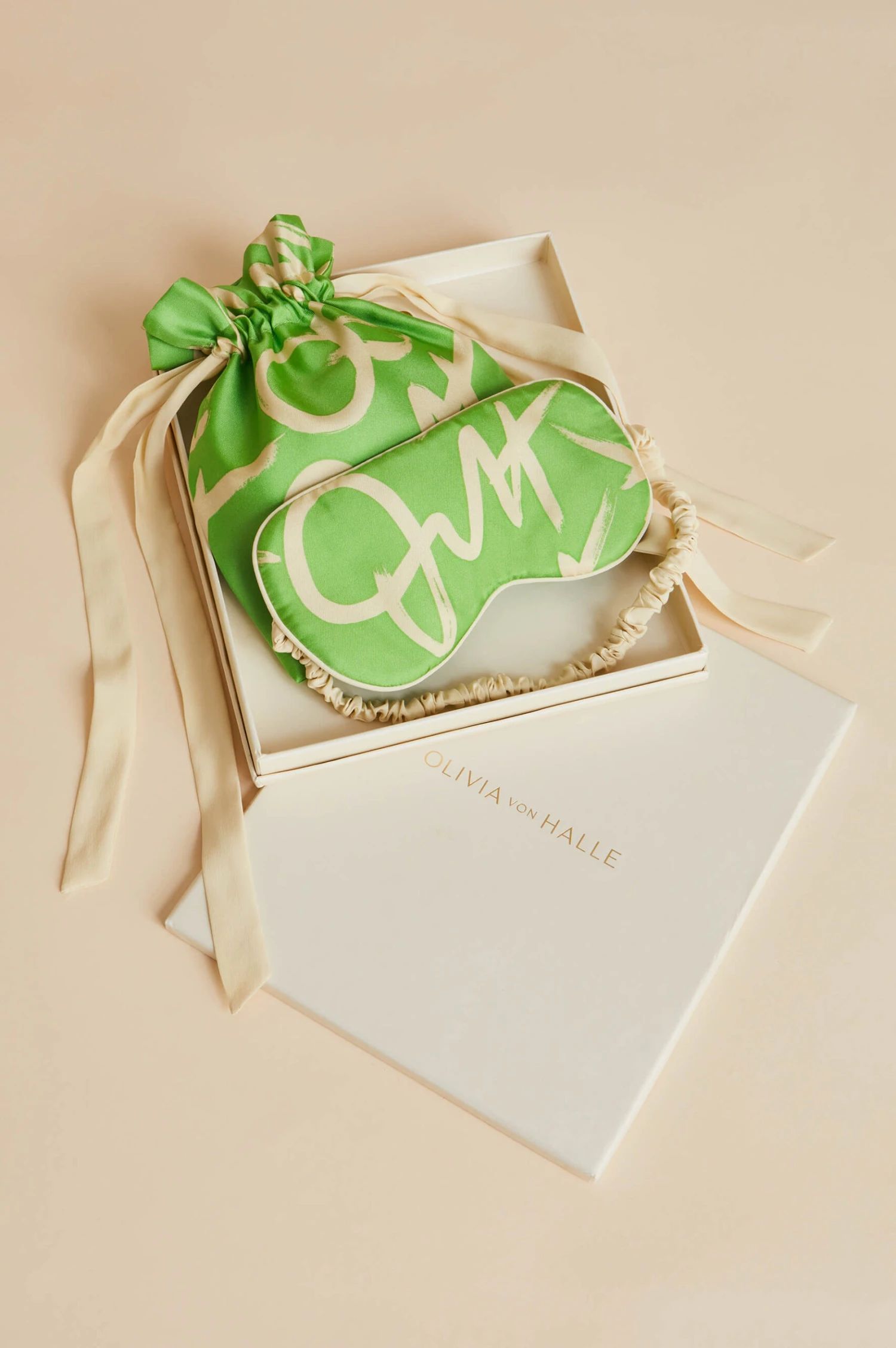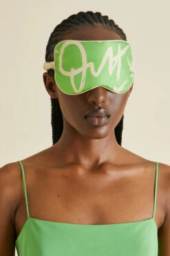 Screen-printed in tantalising parakeet green silk twill, this elegant eye mask with matching drawstring bag features our new signature pattern. Pack it in your suitcase and you’ll leave your mark wherever you go.
