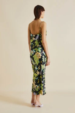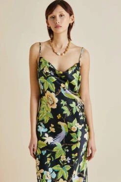 Shimmy into our signature 19 momme silk and dream of distant vistas in our stunning Bibi bias-cut slip dress. Clad this season in an opulent screen-print of flora, fauna and feathered beings, she’s the perfect fit for a burgeoning bird of paradise.