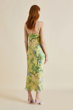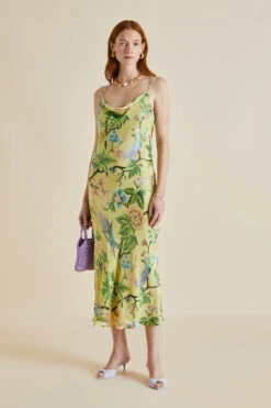 This season our beloved Bibi slip dress wears her love of nature on her sleeve – or rather, on her softly sumptuous bias-cut length. This new pattern inspired by the lost romance of travel features an arcadian scene of tropical blooms and brightly hued birds of paradise, screen-printed on our signature 19-momme silk.