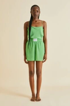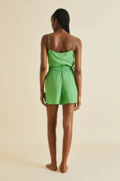 Our verdant Calypso set is fresh to the scene this season. Inspired by a bohemian generation of creatives who sought the dazzle of sun and sea on the French Riviera in the 1920s and 30s, there’s nothing better – or breezier – to wear than this airy camisole set crafted from our luxurious silk crêpe de Chine.