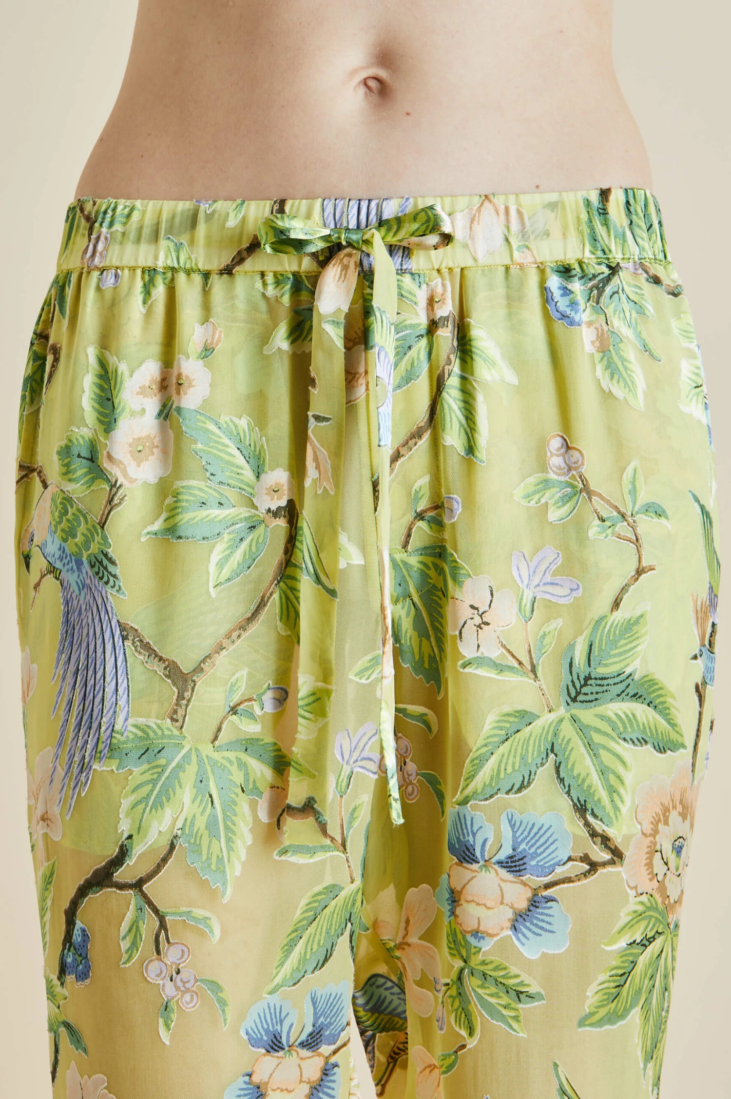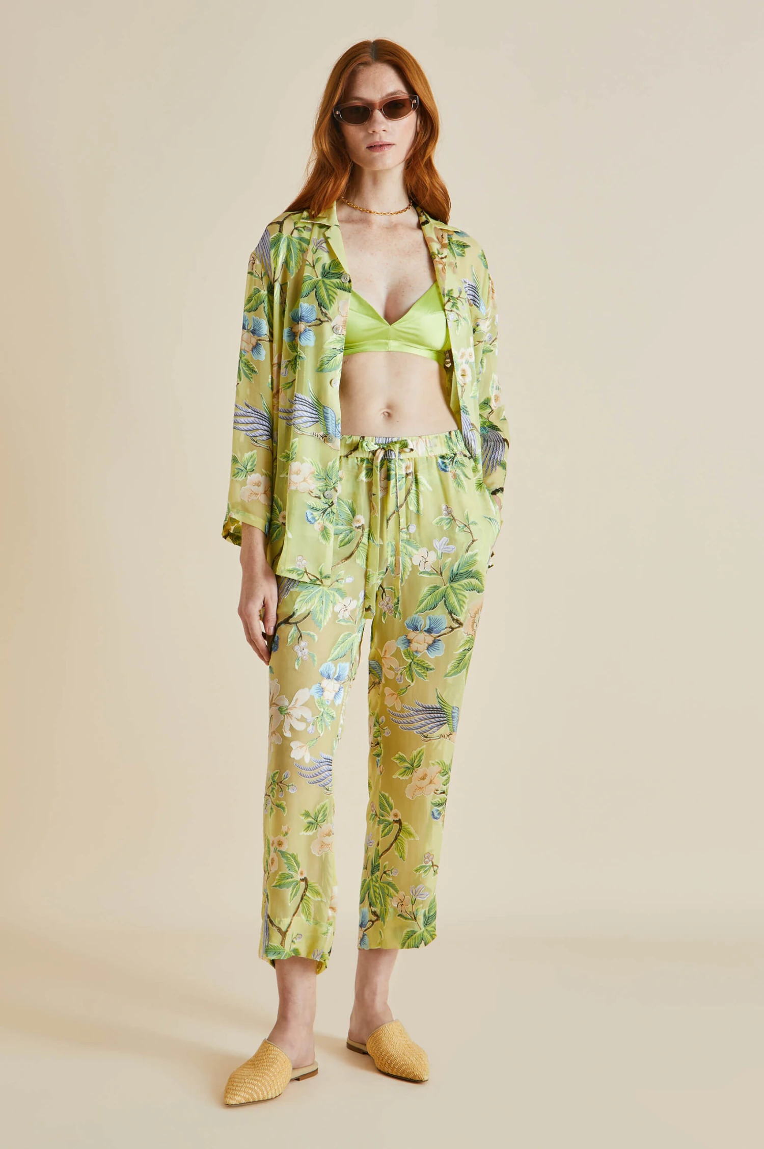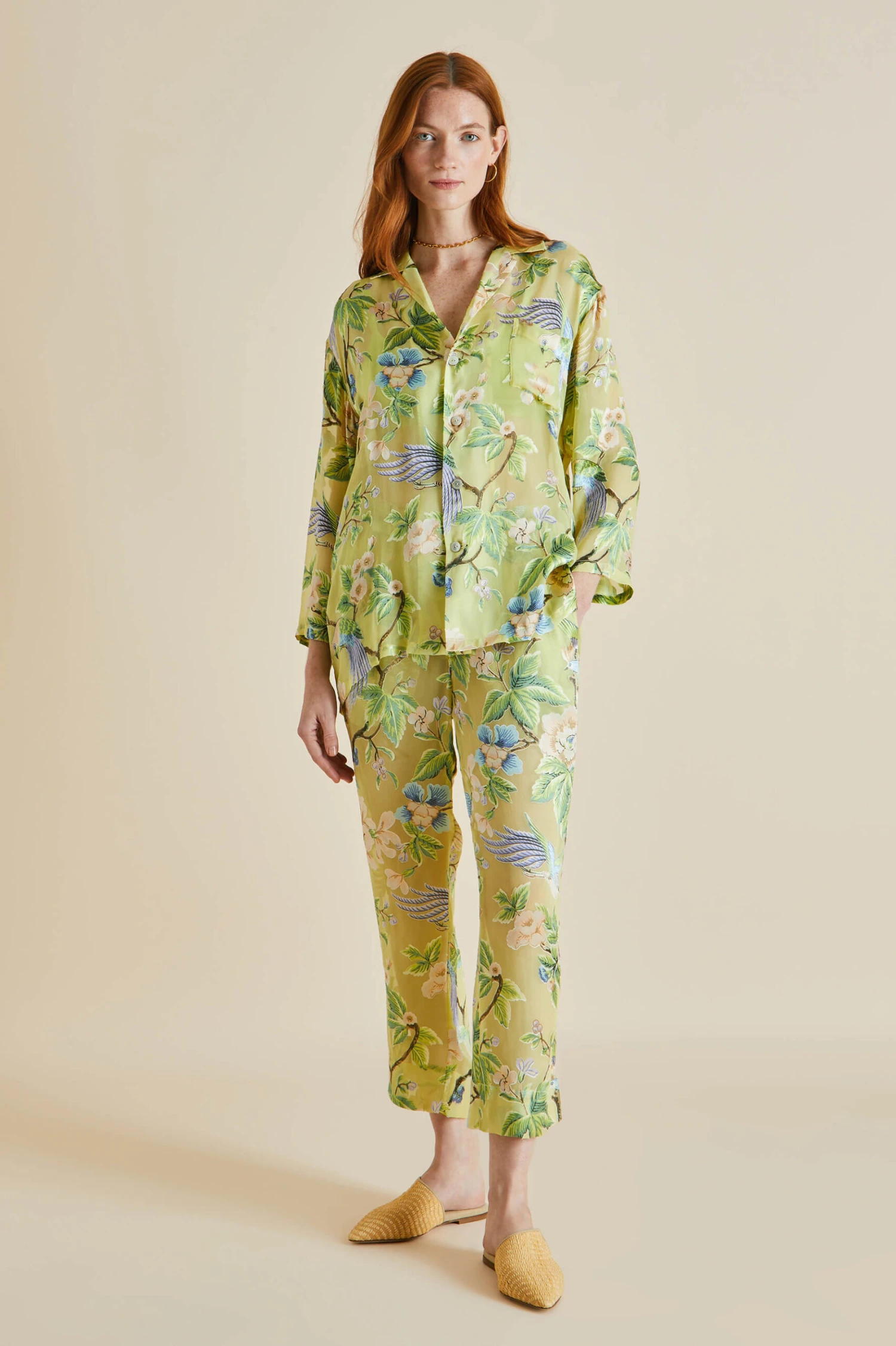 Introducing our newest floral print. Take a trip to paradise in our new season print featuring a heavenly cornucopia of flowers and tropical birds. Our tried-and-true Casablanca silk pajama brings a delicate opulence this season, paying homage to travel at its most romantic and nature at its most extravagant. This ornate silk devoré set is designed with all genders in mind, its relaxed silhouette ready to be worn by all.