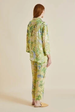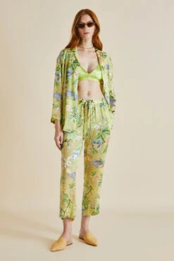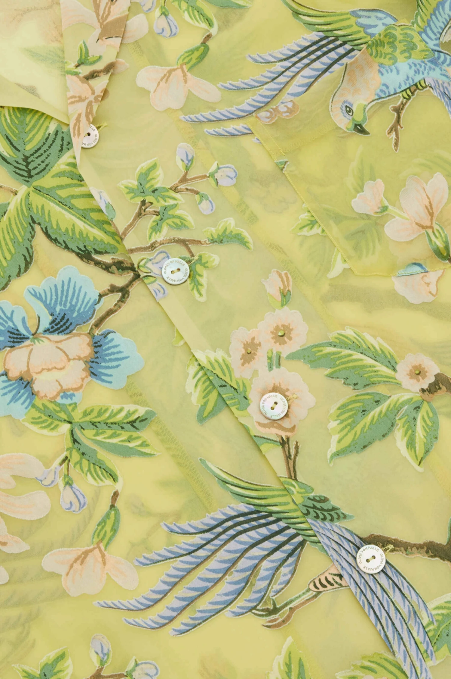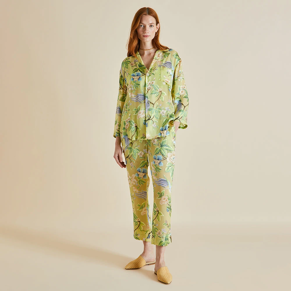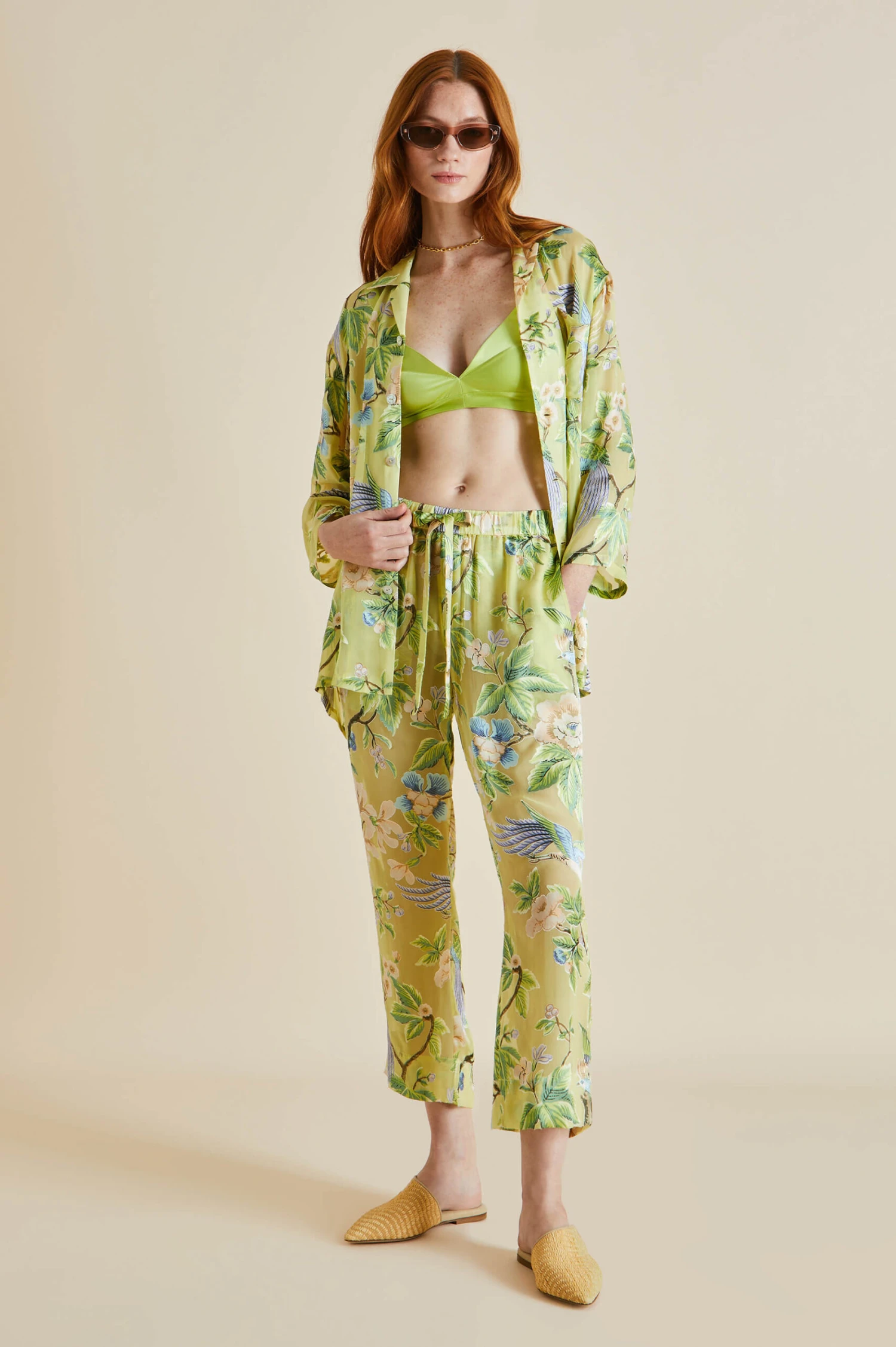 Introducing our newest floral print. Take a trip to paradise in our new season print featuring a heavenly cornucopia of flowers and tropical birds. Our tried-and-true Casablanca silk pajama brings a delicate opulence this season, paying homage to travel at its most romantic and nature at its most extravagant. This ornate silk devoré set is designed with all genders in mind, its relaxed silhouette ready to be worn by all.