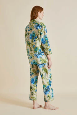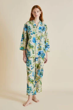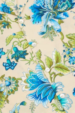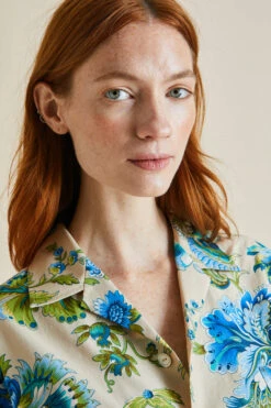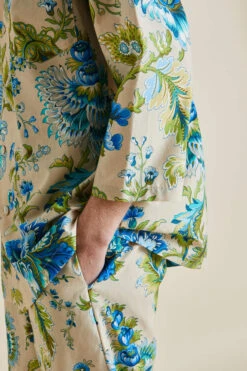 Like the rich, musky fragrance of its floral design, the Casablanca pajama brings a heady beauty in its relaxed proportions and ornately patterned cotton silk. This opulent pajama set takes its inspiration from long and languorous journeys, its majestic print and vibrant colors designed with tropical luxury in mind. This style and silhouette is suitable for all genders, ready to be worn by all.