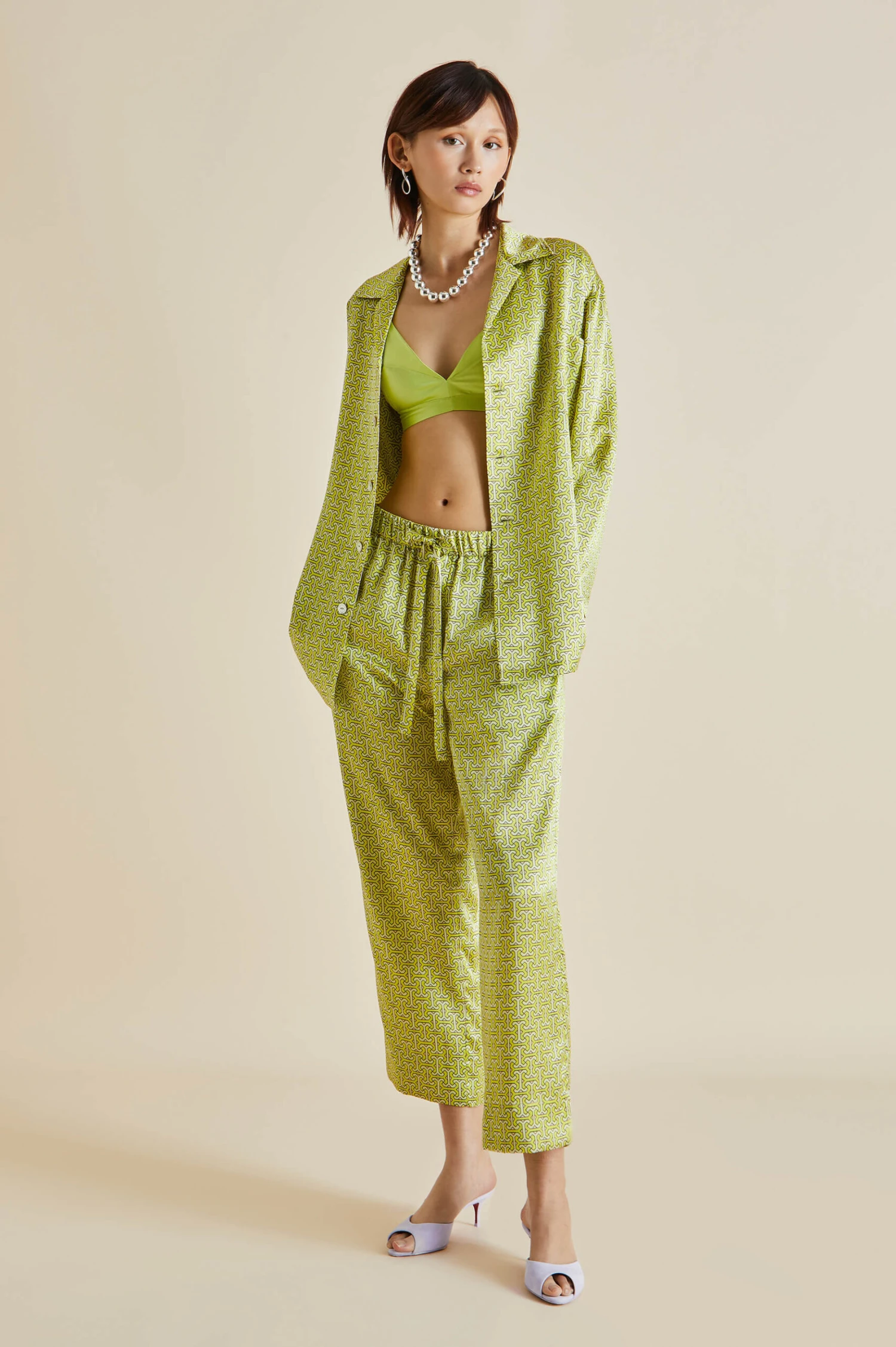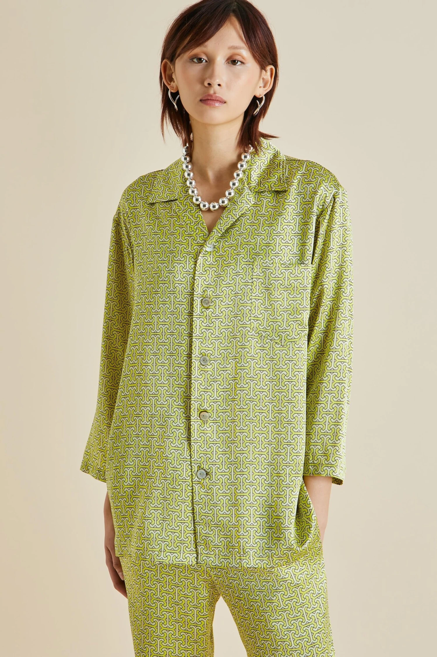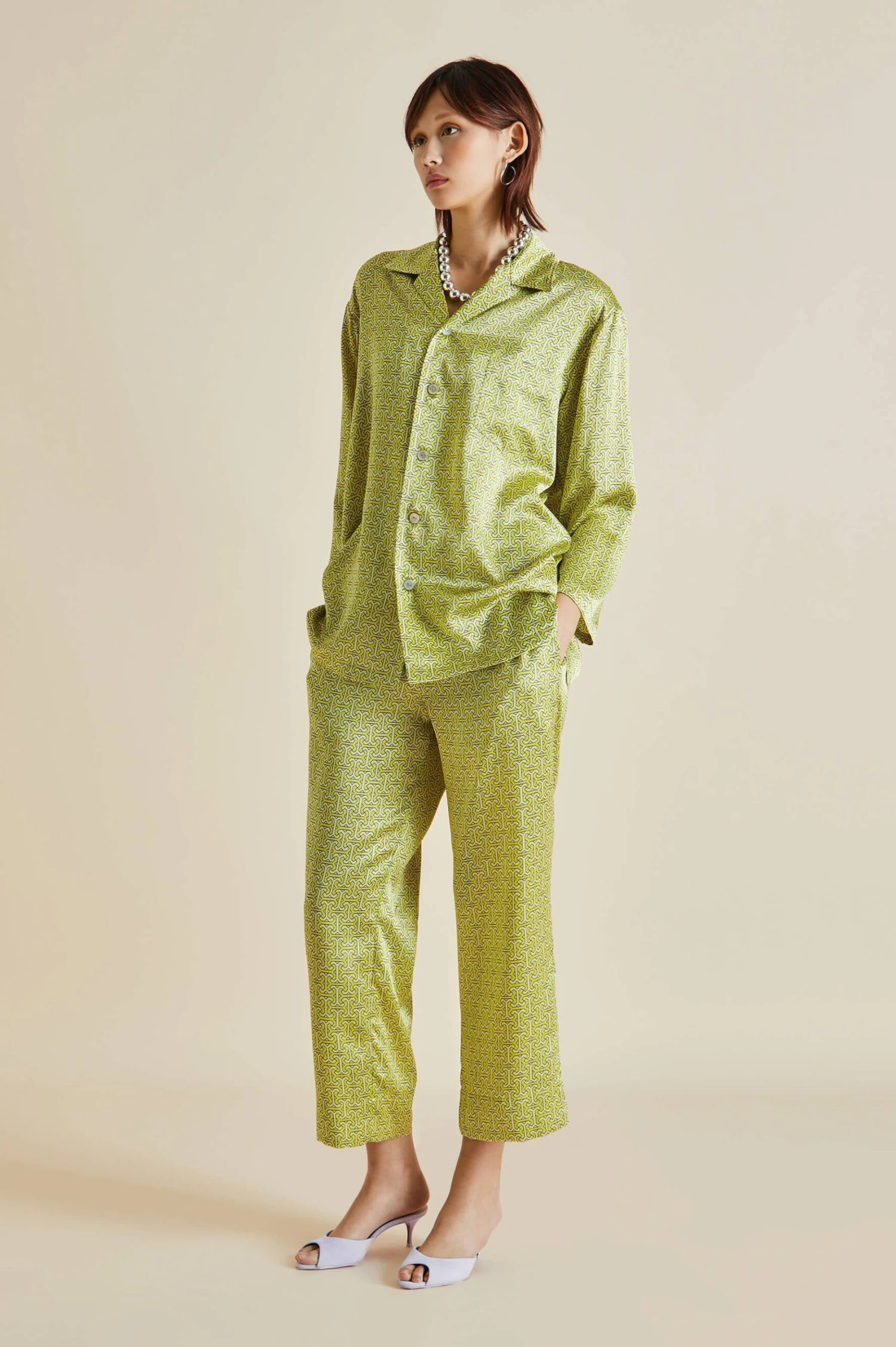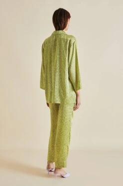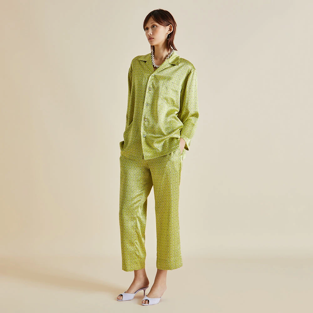 Our Casablanca silk pajama journeys to Singapore’s Raffles Hotel this season – an establishment surrounded by tropical gardens where the air smells of frangipani and birdsong drifts through the leaves. Our classic silhouette, suitable for all genders, receives a tropical update in verdant green 19-momme silk, ideal for loafing around on humid days.