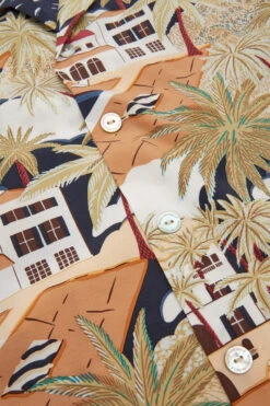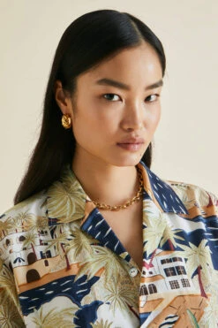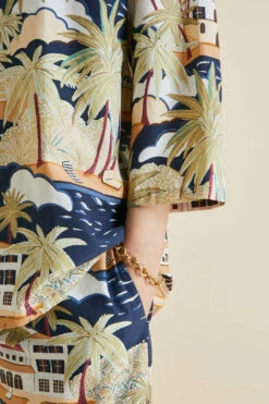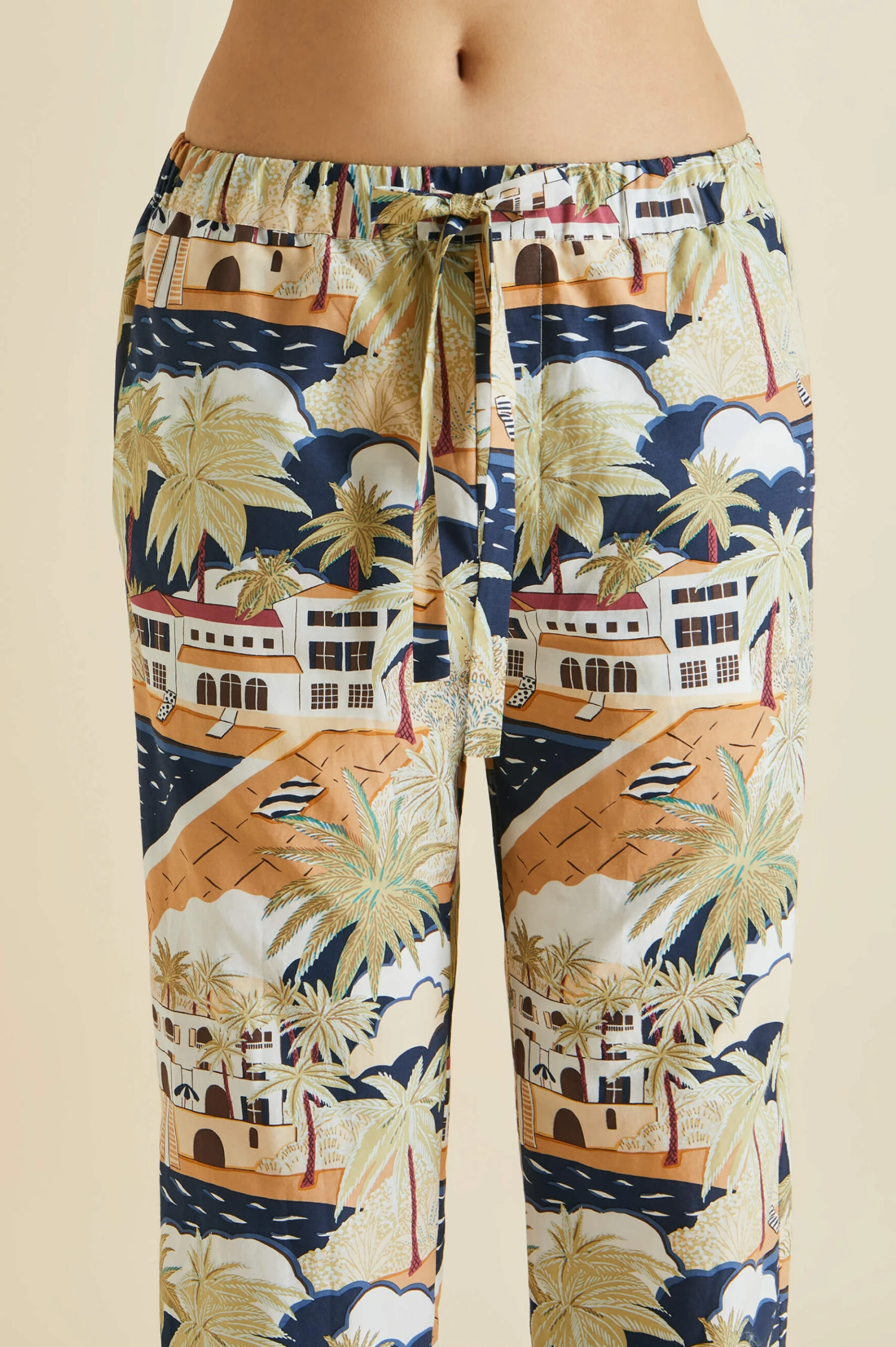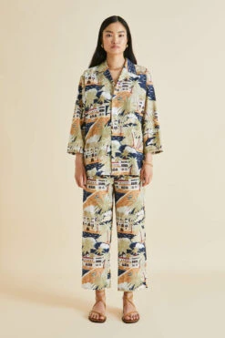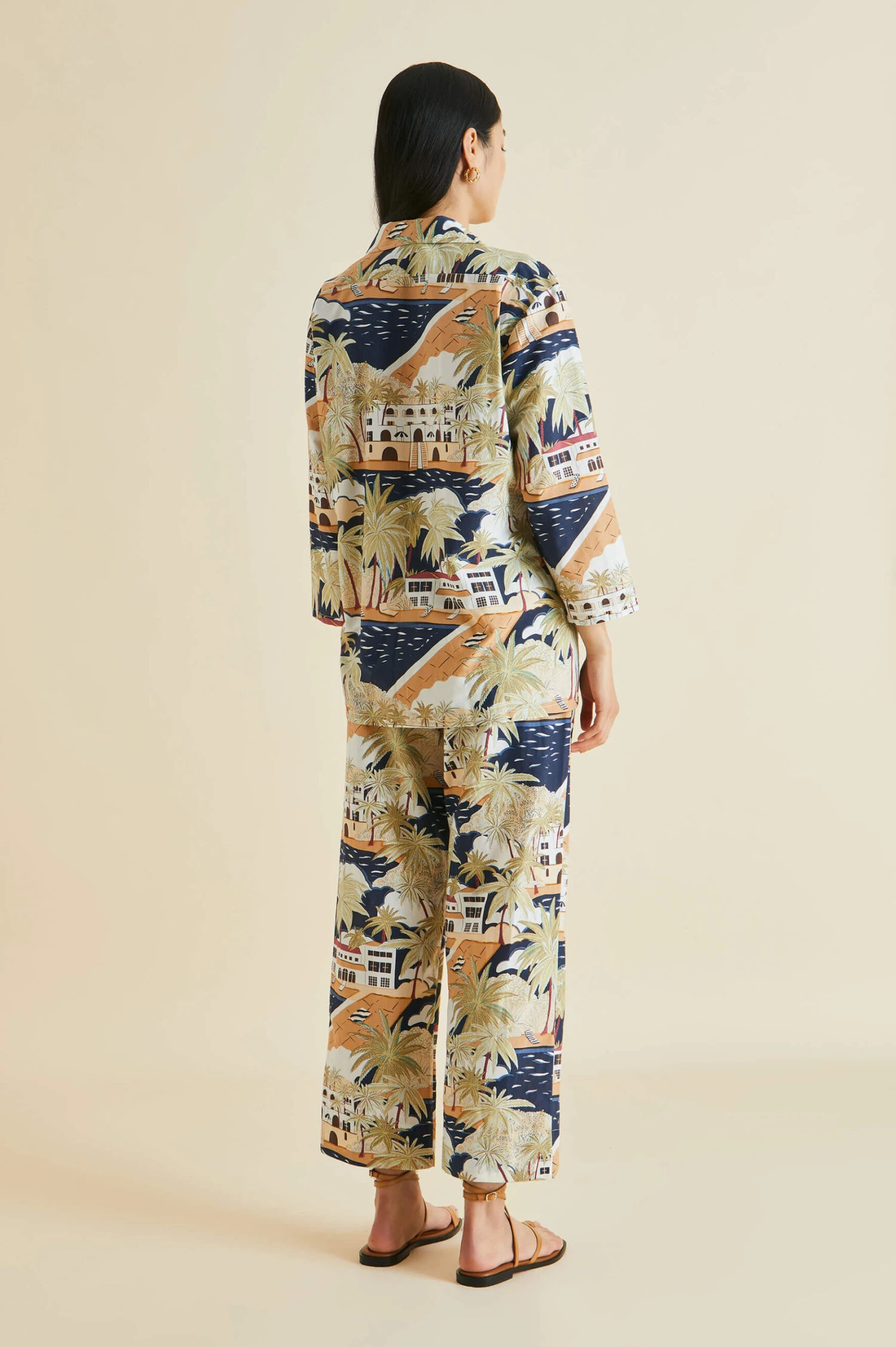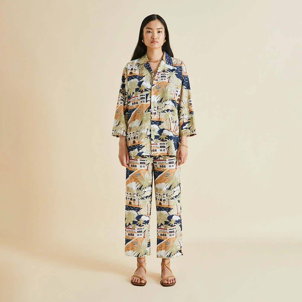 This season, Olivia von Halle conjures the splendor of the French Riviera in the 1920s and 30s, with prints capturing its coastal-hued shades and distinctive architecture. Dream of palm trees and swimming after dark in our classic cotton-silk Casablanca pajama set – its relaxed fit suitable for all genders.