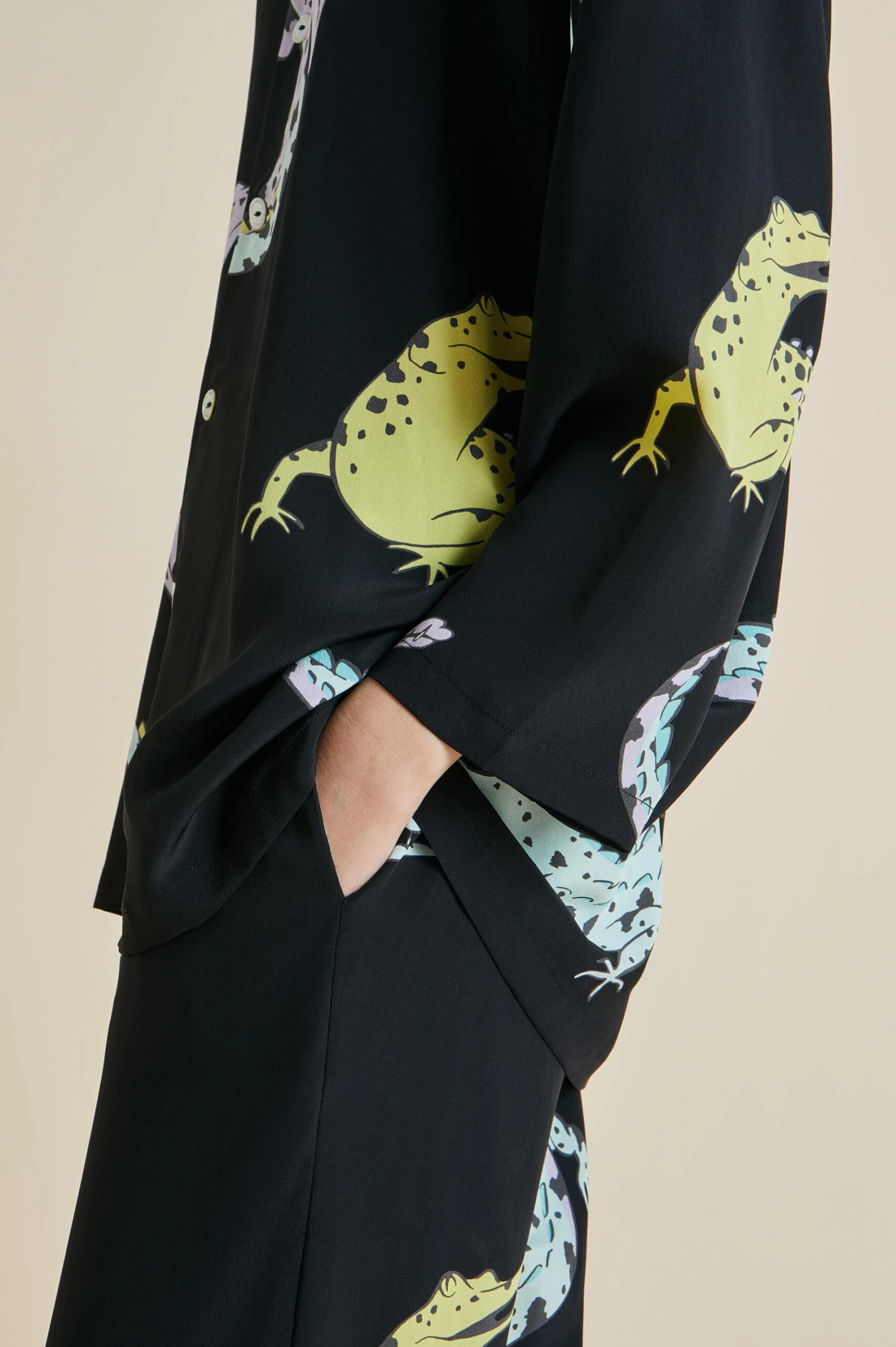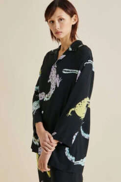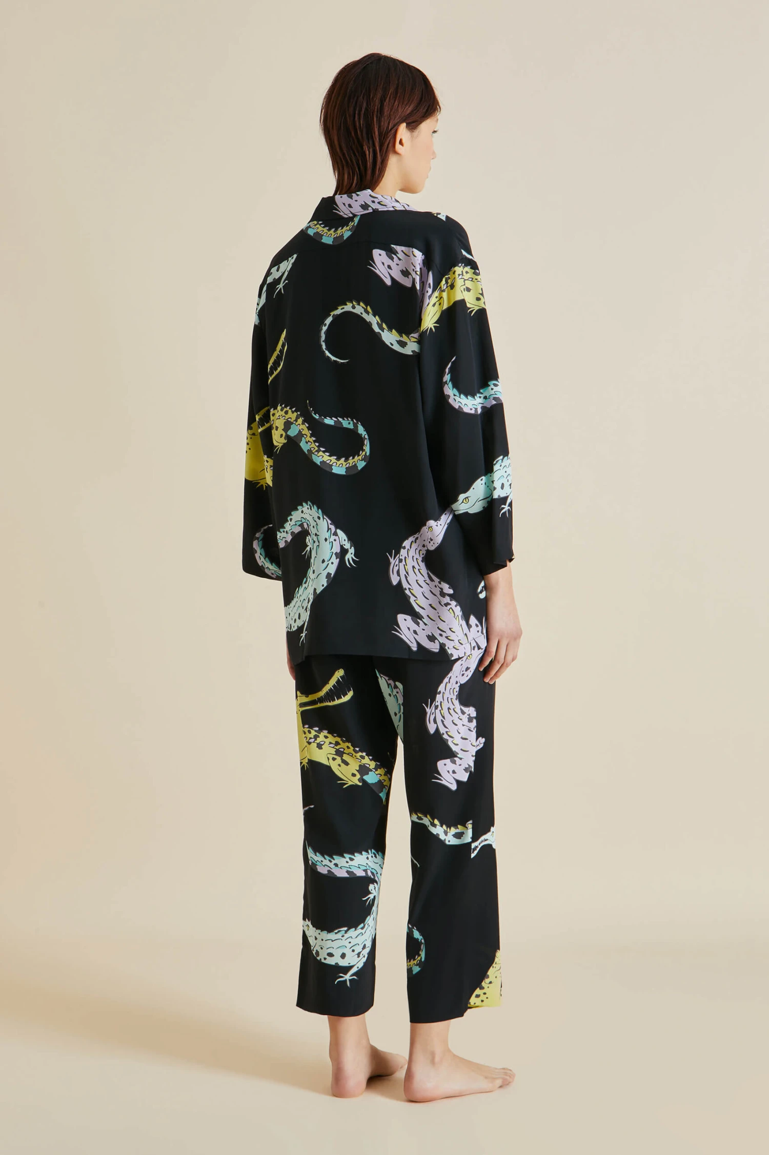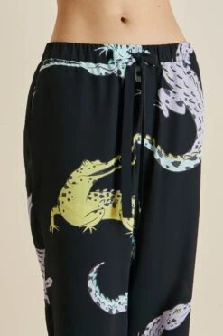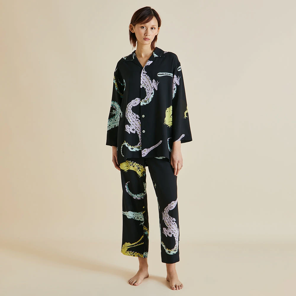 Snap up our signature Casablanca silk pajama in jet black crêpe de Chine, printed with playful crocodiles. This opulent set is suitable for all genders, its relaxed silhouette offering an unfussy take on luxury loungewear. Part of the Spring Summer collection inspired by the lost romance of travel, it’s ideal for all day lazing: whether your terrain of choice is beach, rainforest or mountain.