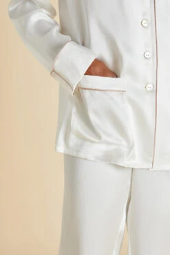 Our Coco silk pajama set is a foundation piece of any luxury wardrobe. This exquisite silk pajama set in luxury ivory silk, with oyster pink piped silk trims, is the ultimate expression of indoor style. Personalise your pair, or match with your Eye Mask Ivory Oyster for a total luxury look. A perfect look for your special day, or a thoughtful gift for that special someone.