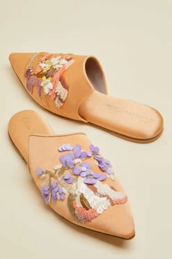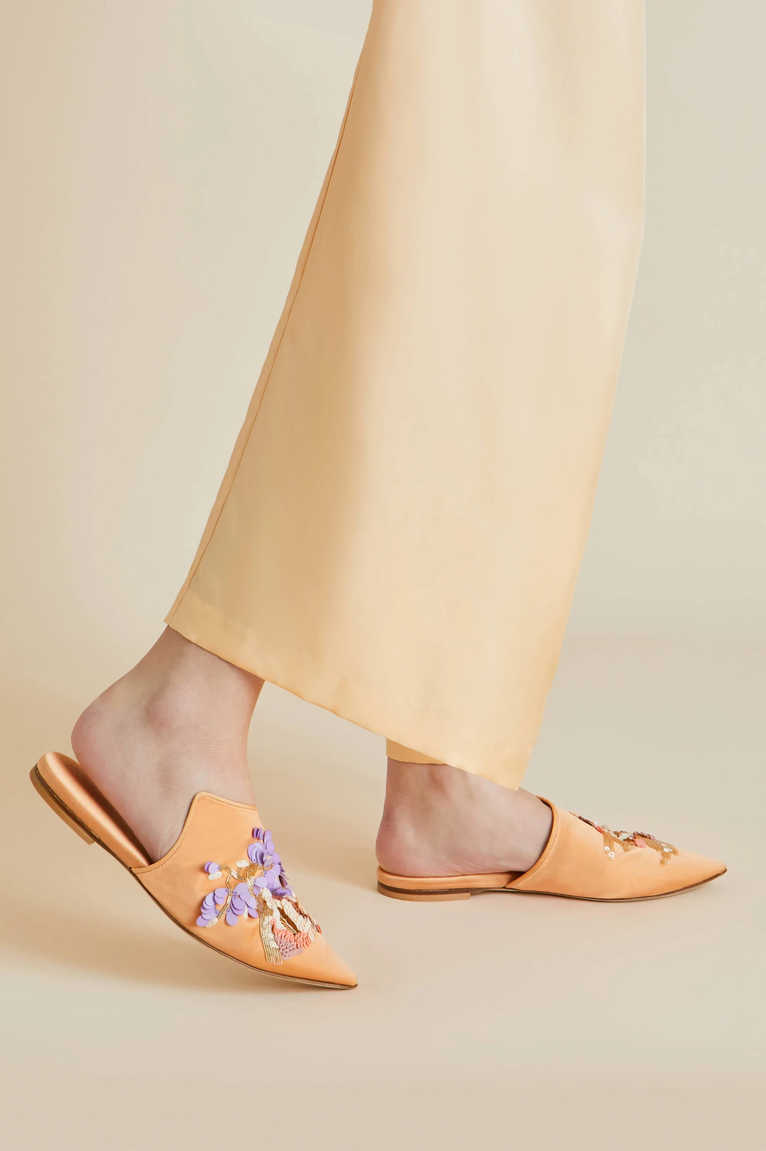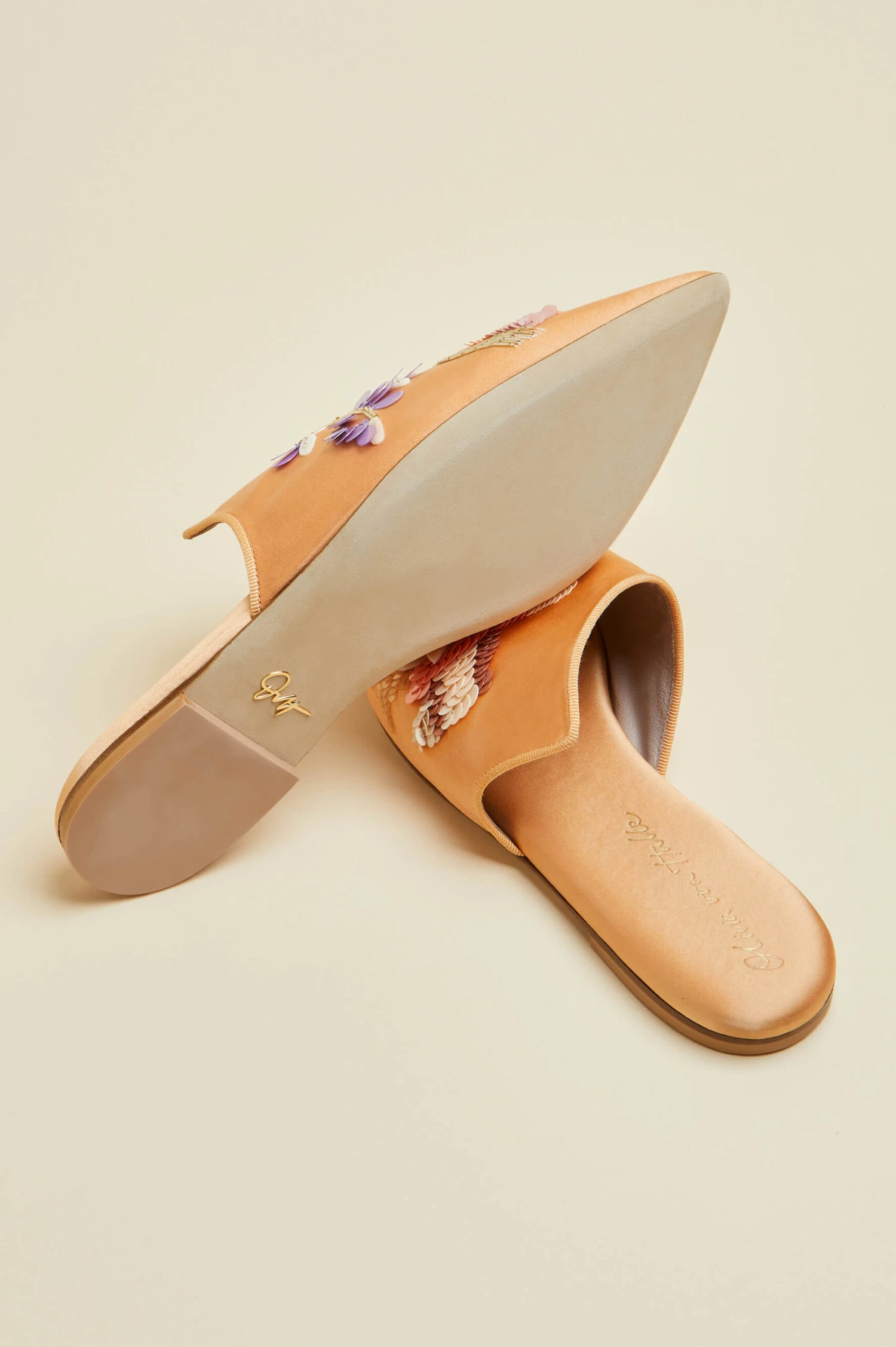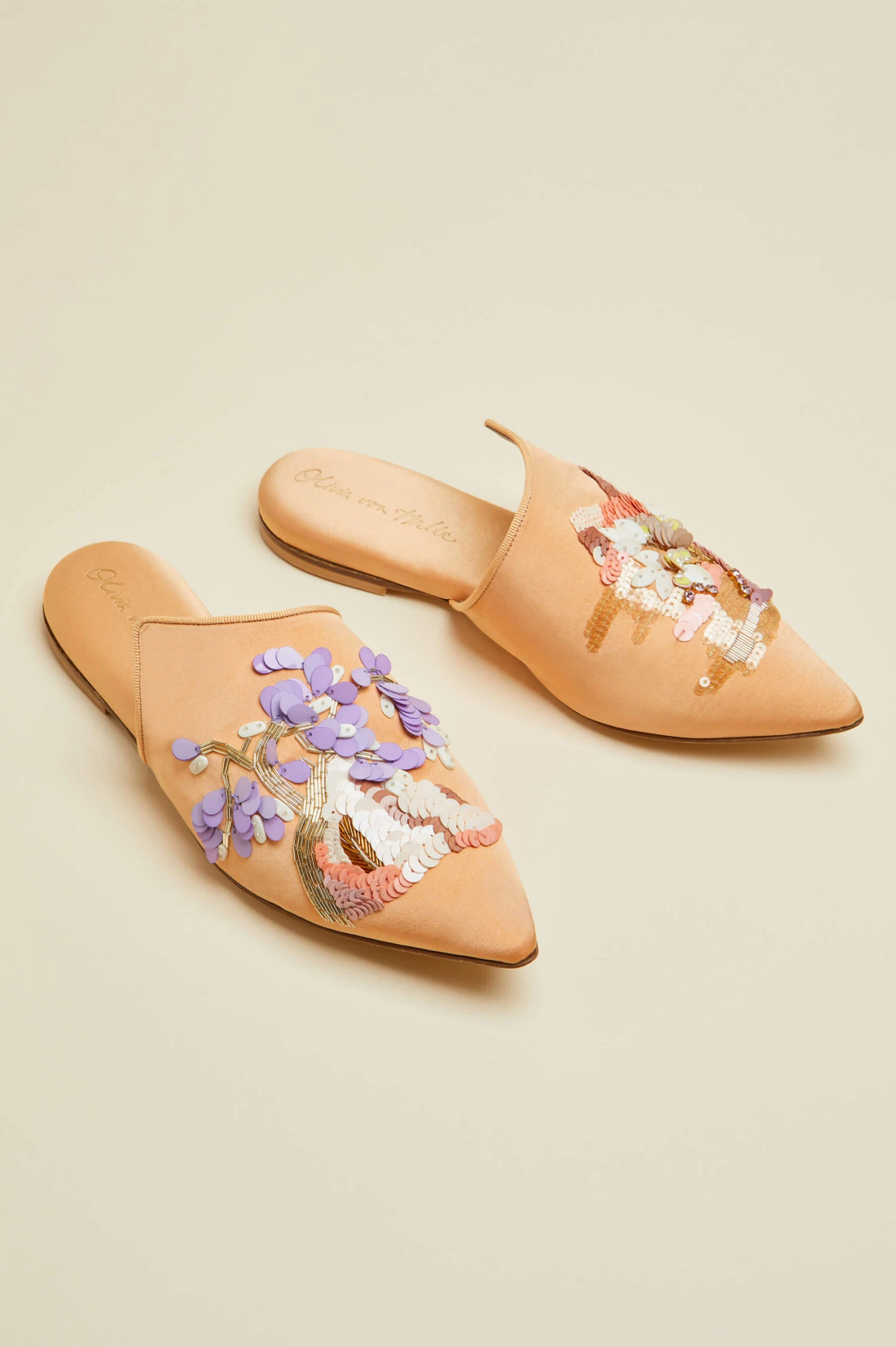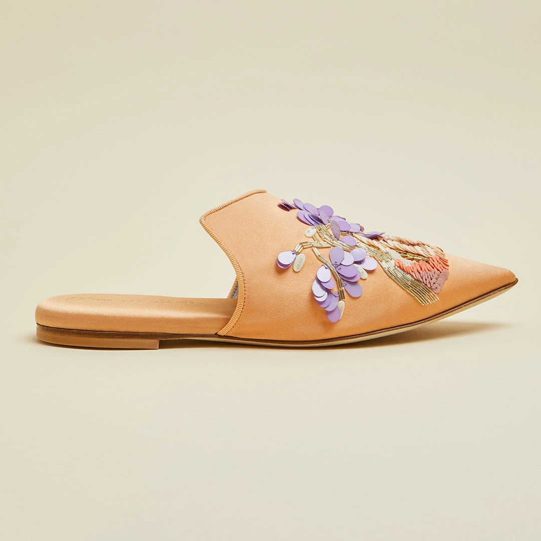 Our classic Contessa slipper trips lightly through the world, idling down unexpected paths and strolling straight towards the horizon. These exquisite silk slippers are hand-embellished with a dreamy mountainscape in sequins, designed with jetsetters in mind. Made exclusively in a family-run factory in Tuscany, these limited edition slippers are one of just twenty-nine and come with their own unique number.