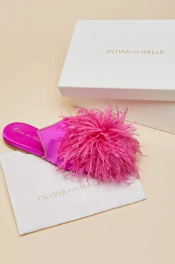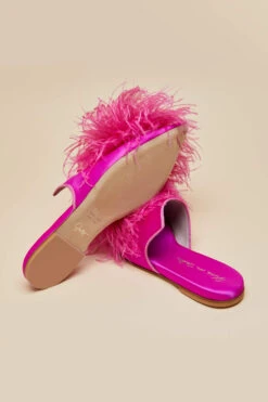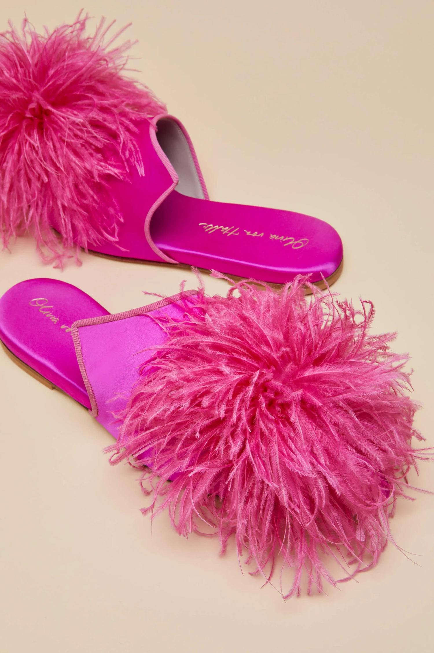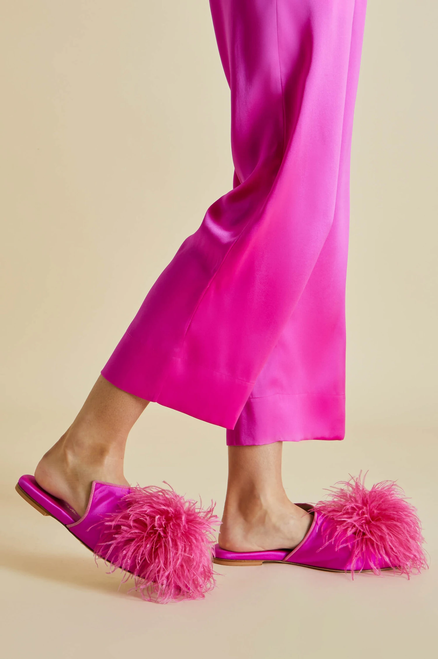- Luxury Freesia silk slipper with Raspberry Ostrich feather pom-pom detail