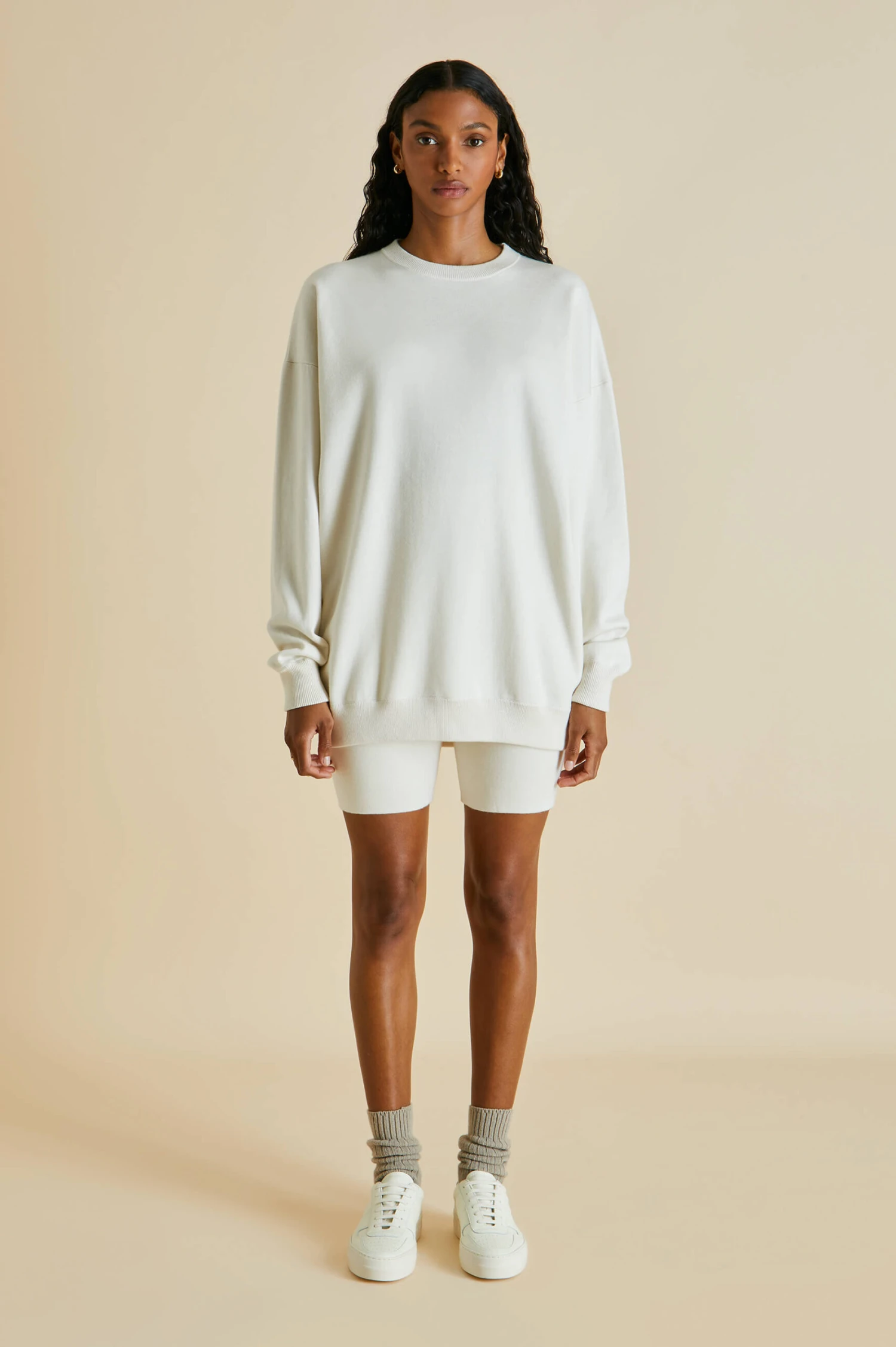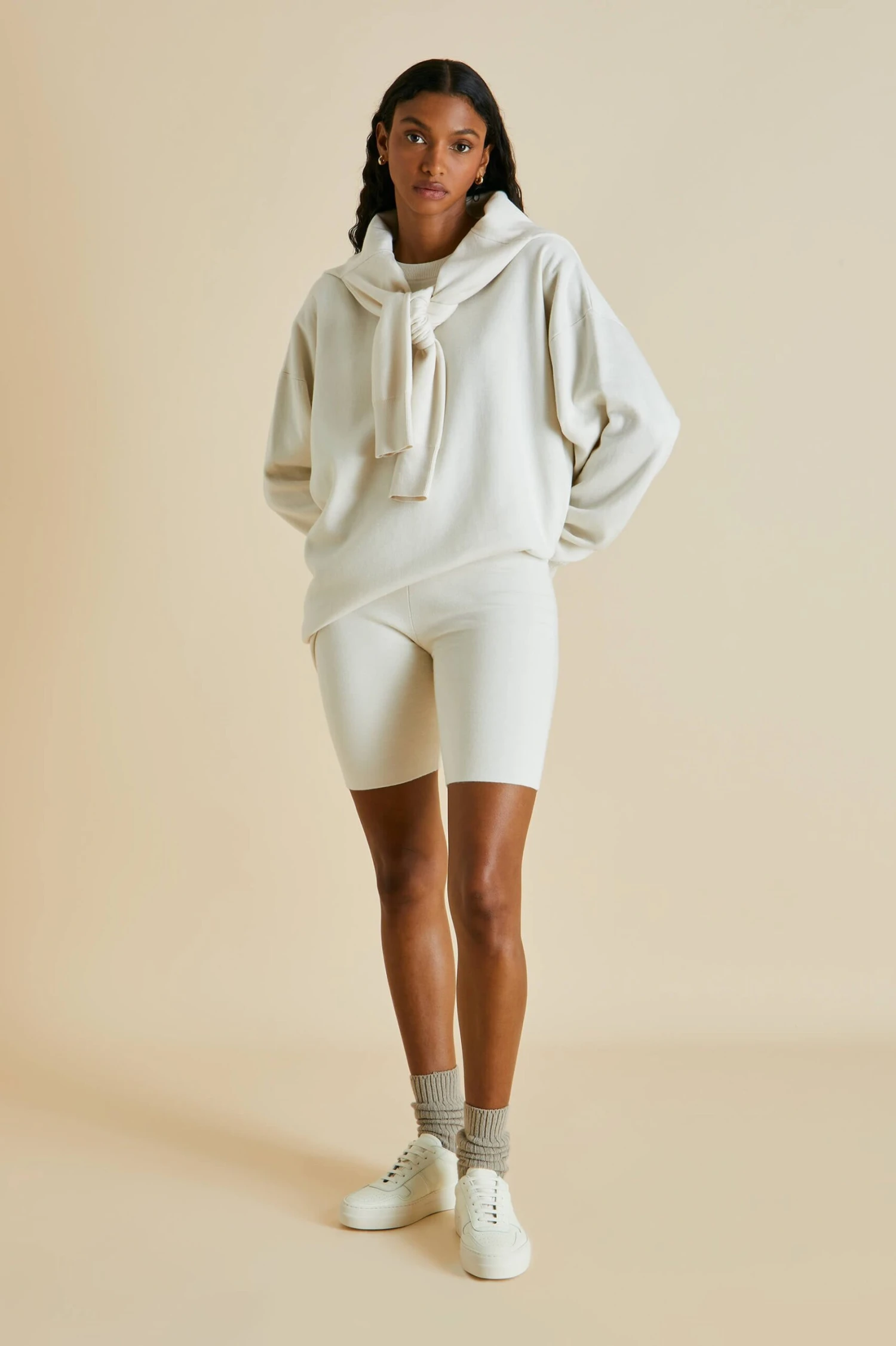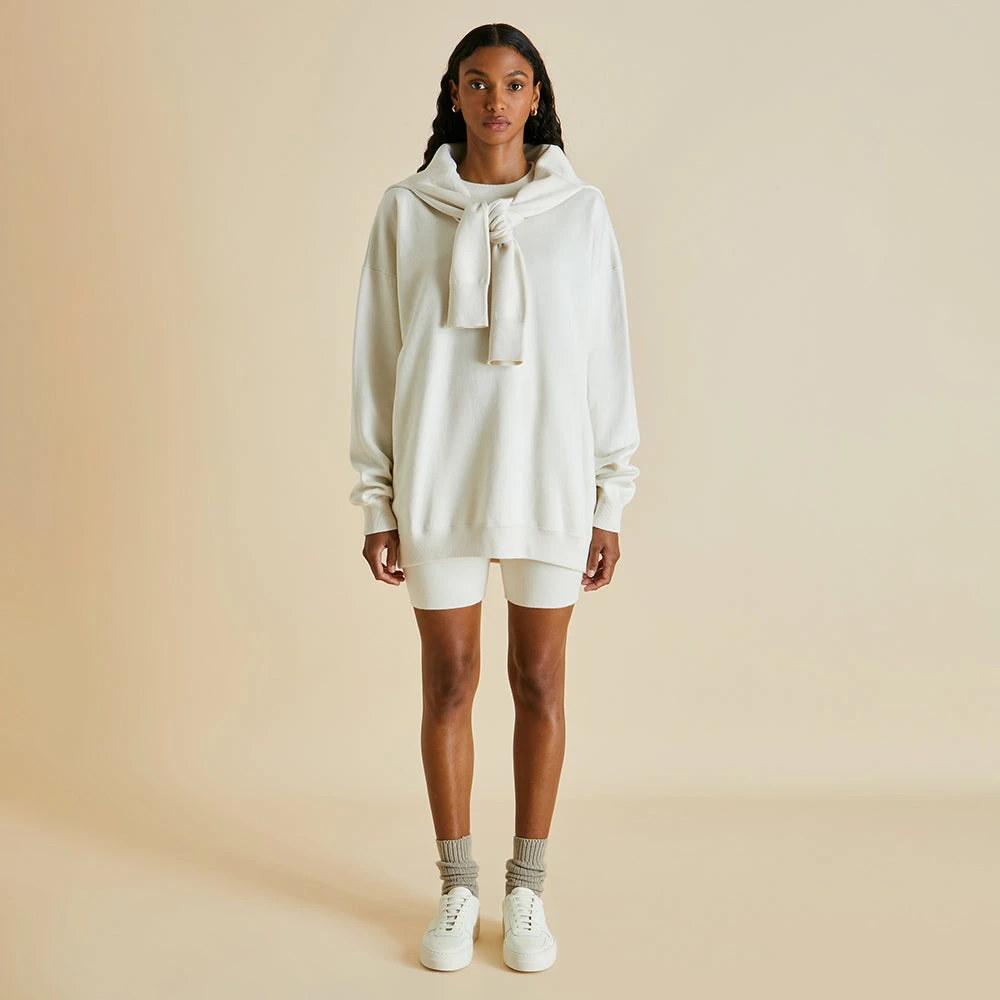 OvH expands on its singular vision of luxurious loungewear with the debut of the Didi. Inspired by the minimal, sports-luxe aesthetic of the 1990s, she consists of an oversized crew-neck jumper and slim-fit cycling shorts that are spun from a tactile silk cashmere-blend. For the final word in understated, off-duty elegance, slip into our classic Alaska colourway.ย