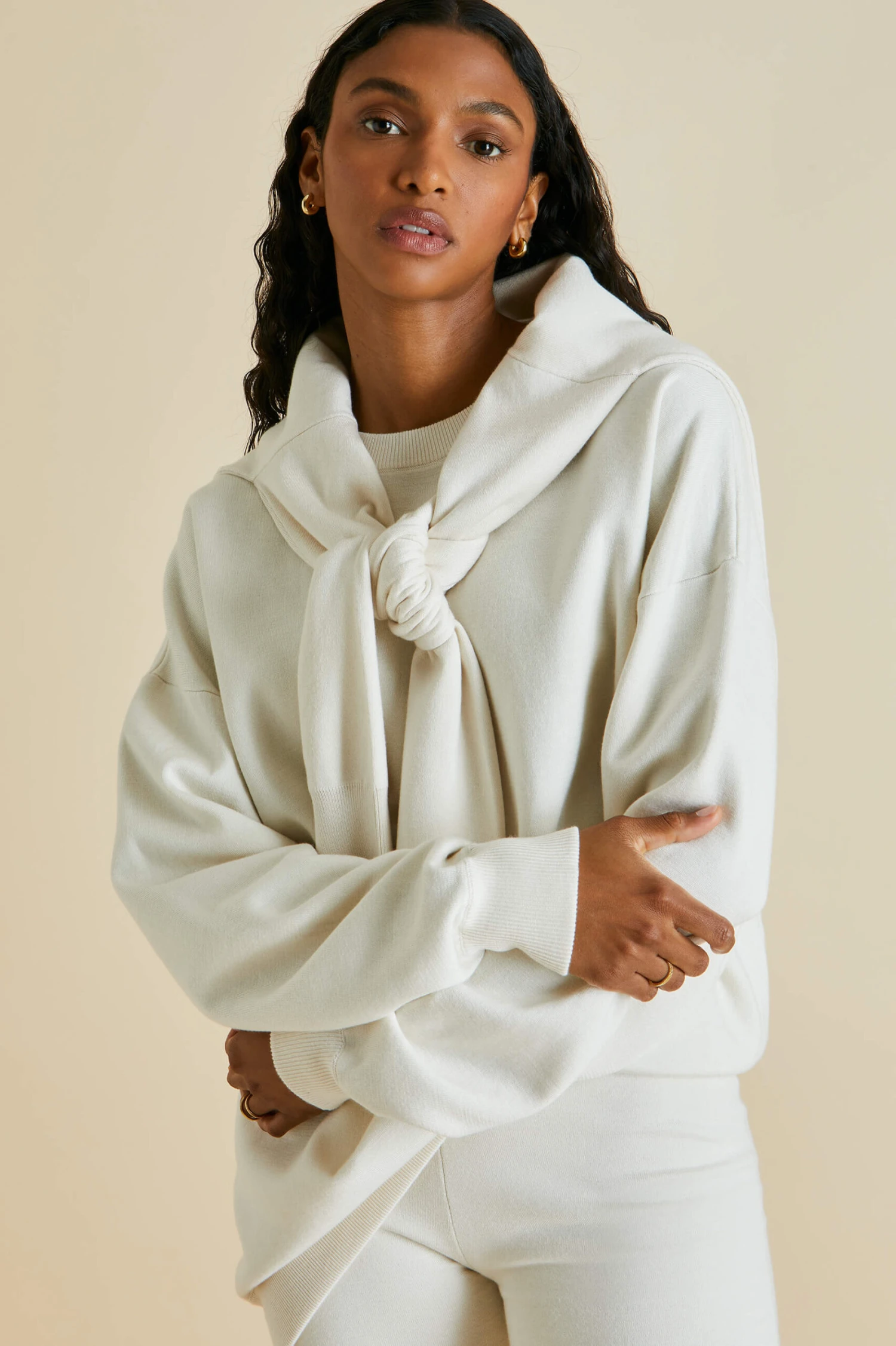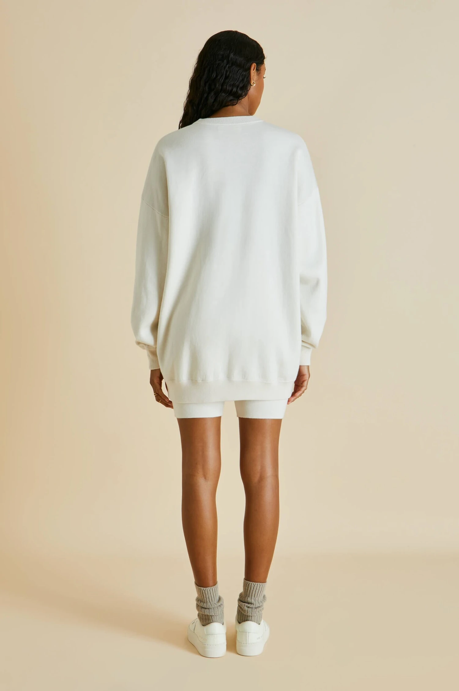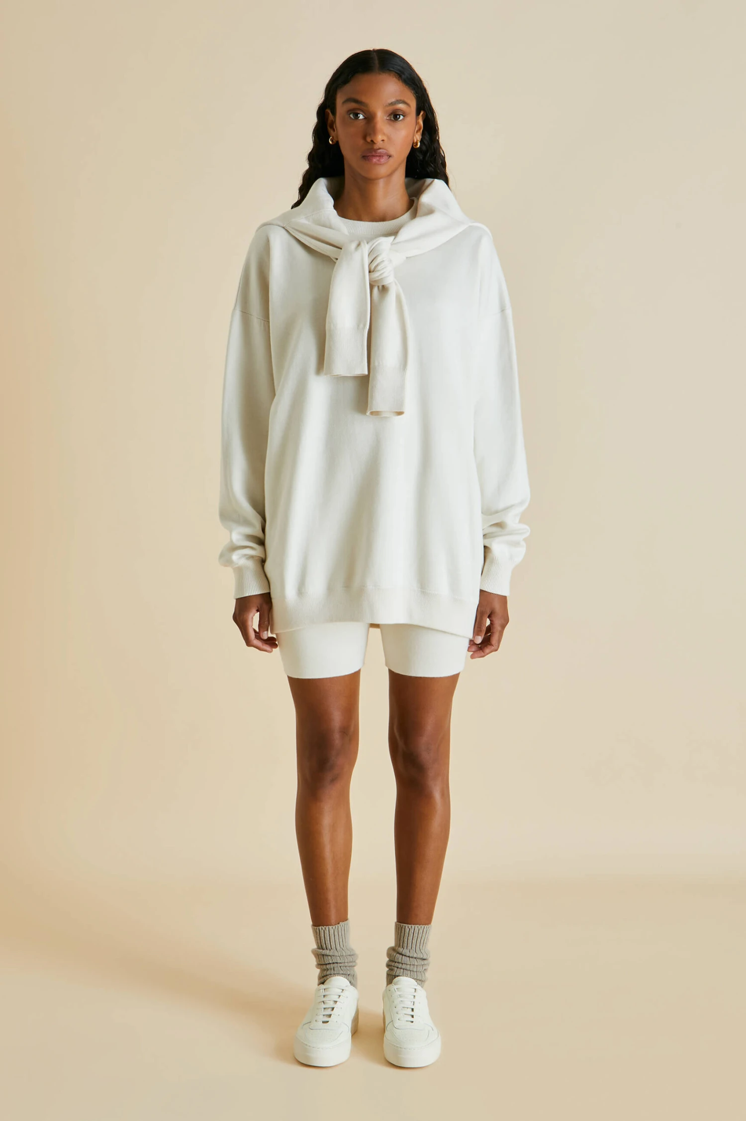 OvH expands on its singular vision of luxurious loungewear with the debut of the Didi. Inspired by the minimal, sports-luxe aesthetic of the 1990s, she consists of an oversized crew-neck jumper and slim-fit cycling shorts that are spun from a tactile silk cashmere-blend. For the final word in understated, off-duty elegance, slip into our classic Alaska colourway.ย