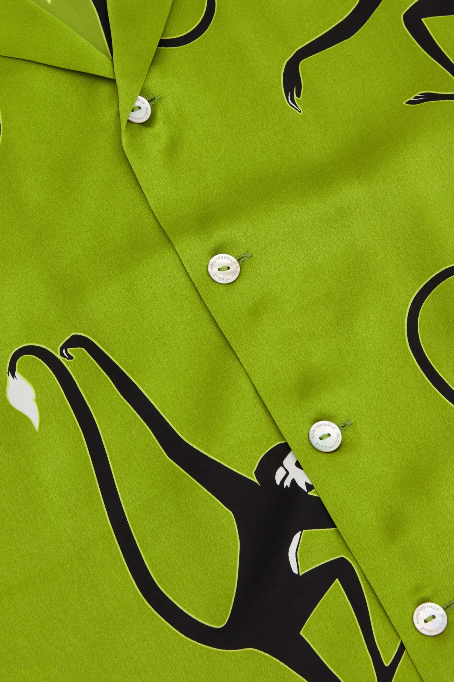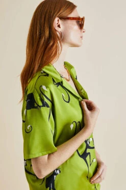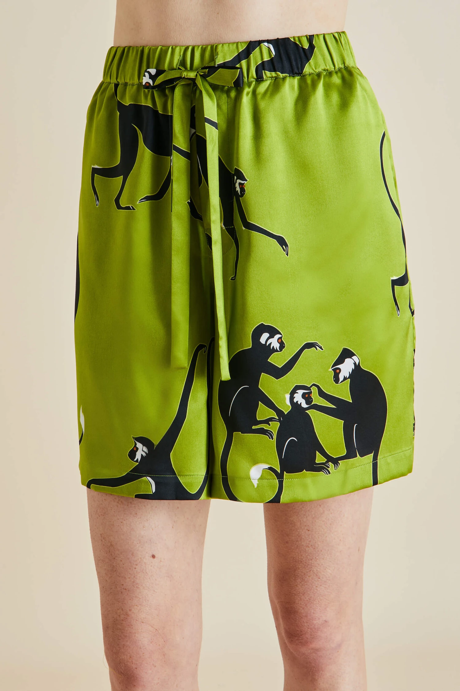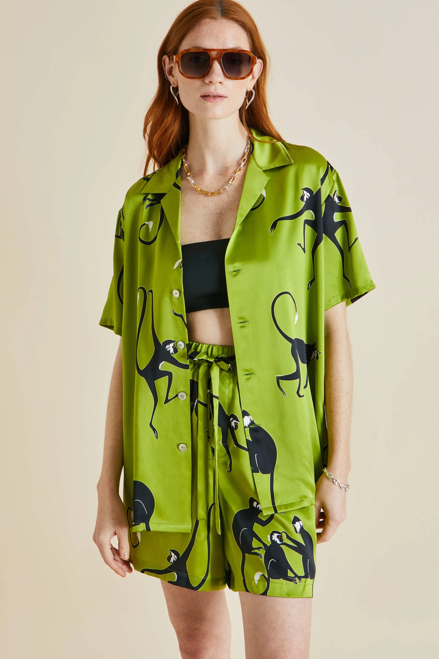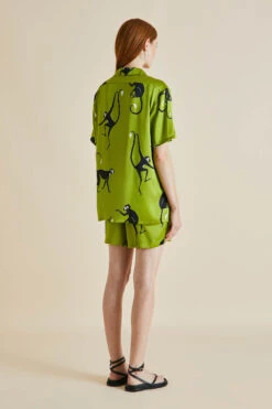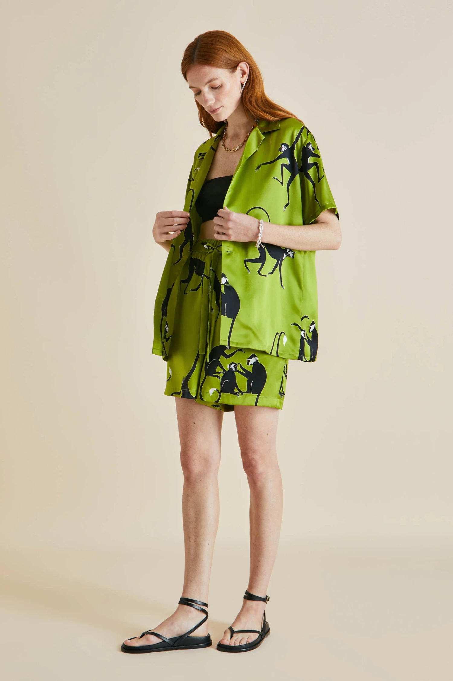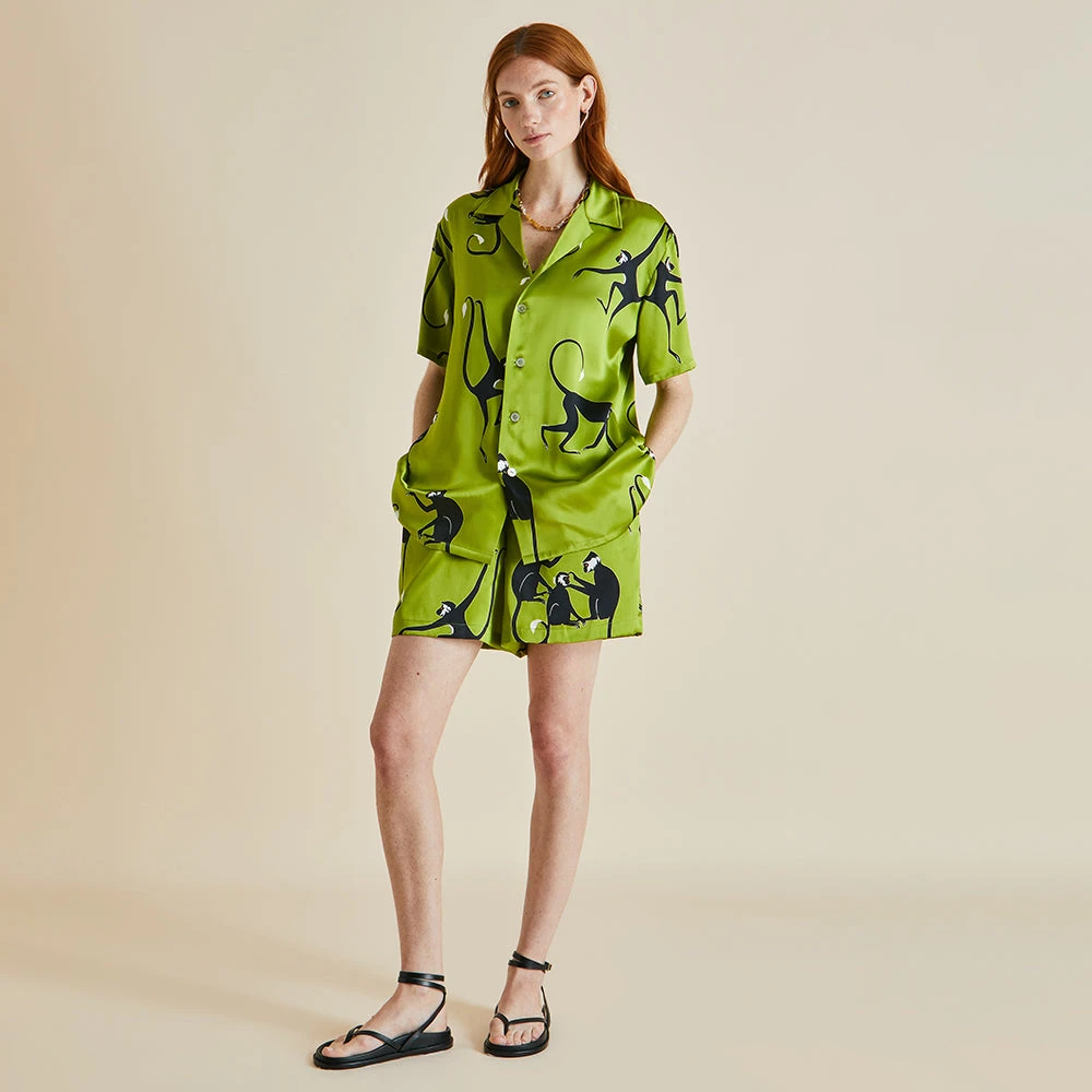 Enjoy an elegant kind of monkey business with our screen-printed 19-momme silk. This spirited silk nightshirt and shorts set offers a tropical twist on an Olivia von Halle classic, its zesty citrus green shade and relaxed, genderless fit ideal for any would-be adventurer.