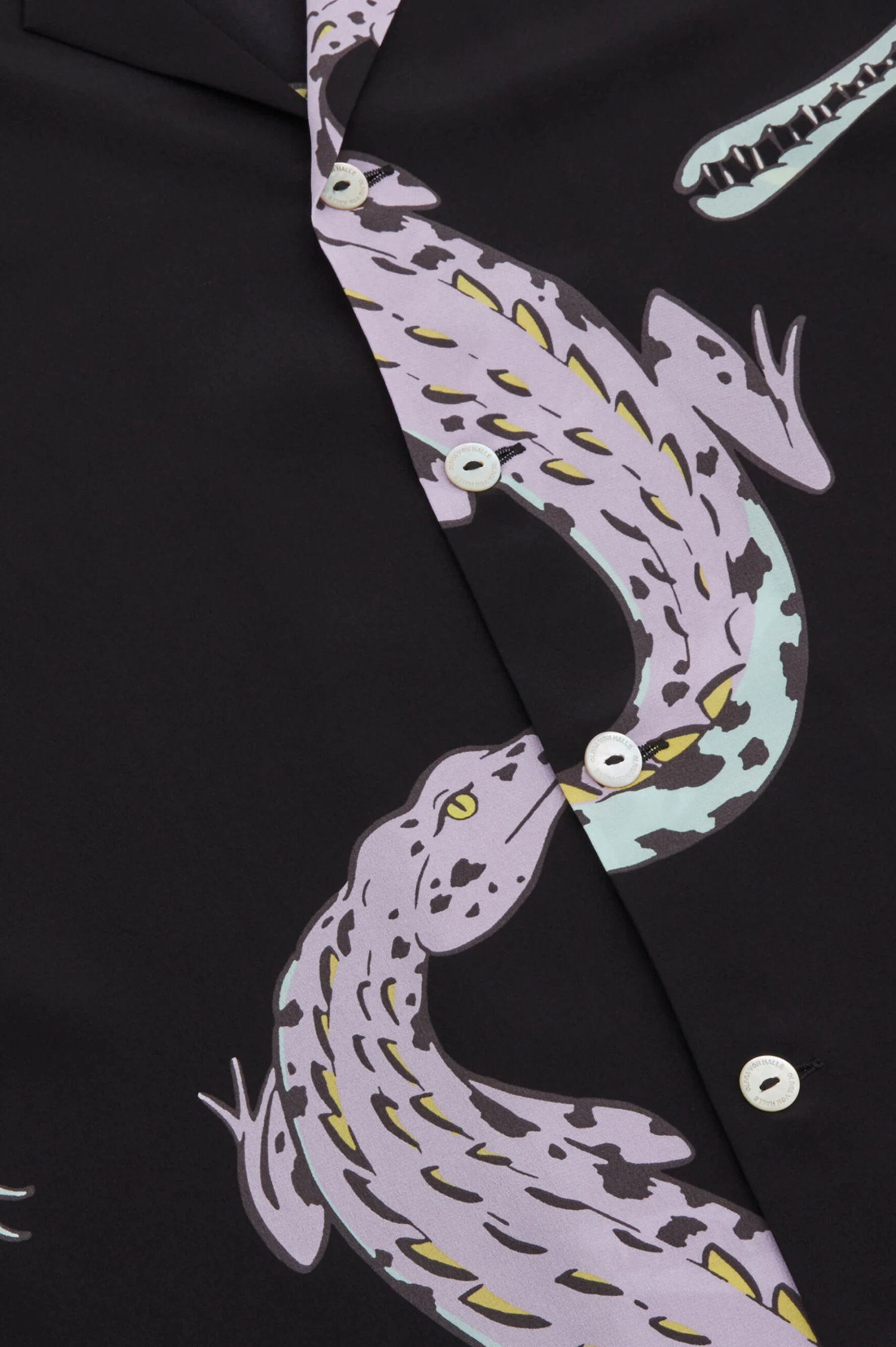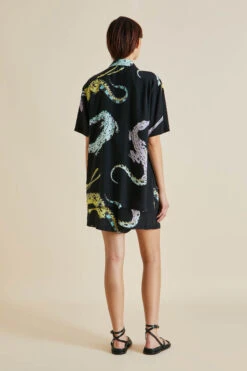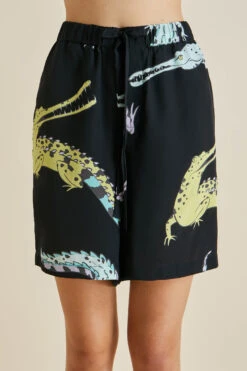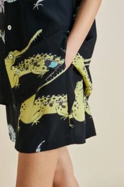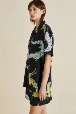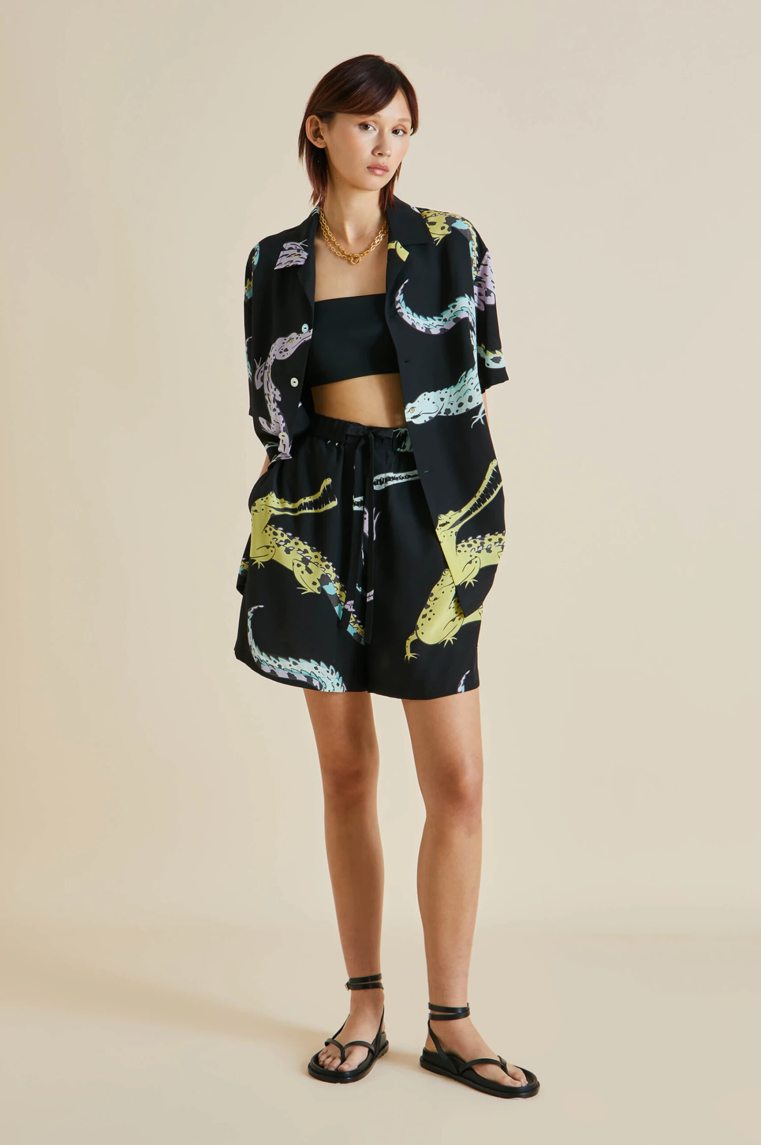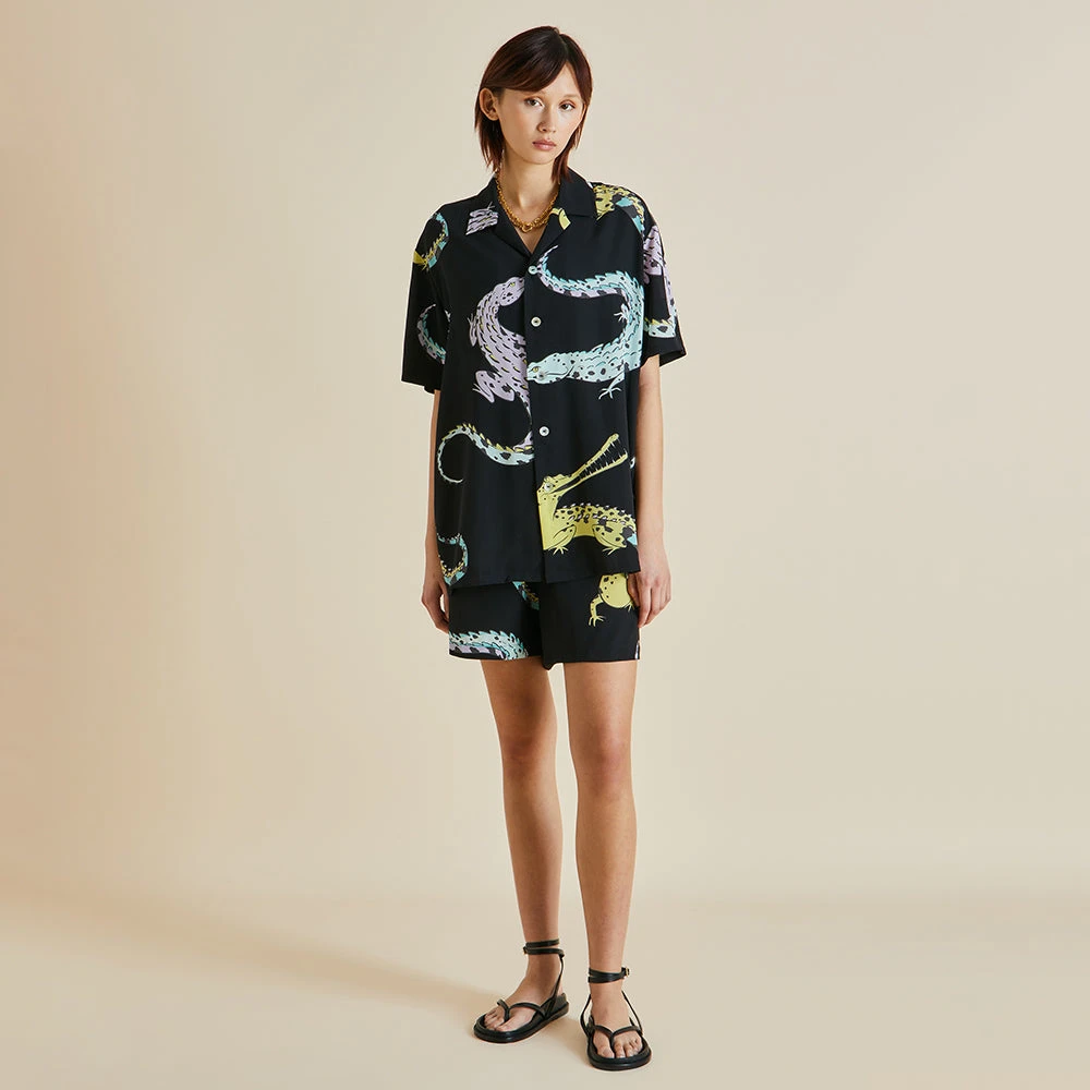 Adorned with sly, screen-printed crocodiles, this playful silk nightshirt and shorts set is designed with jetsetters in mind. Part of the spring summer collection inspired by the winding route of the Eastern & Oriental Express through Singapore, Malaysia and Thailand, its cooling silk crêpe de Chine and relaxed, genderless silhouette make it the ideal fit for a warm and welcoming climate.