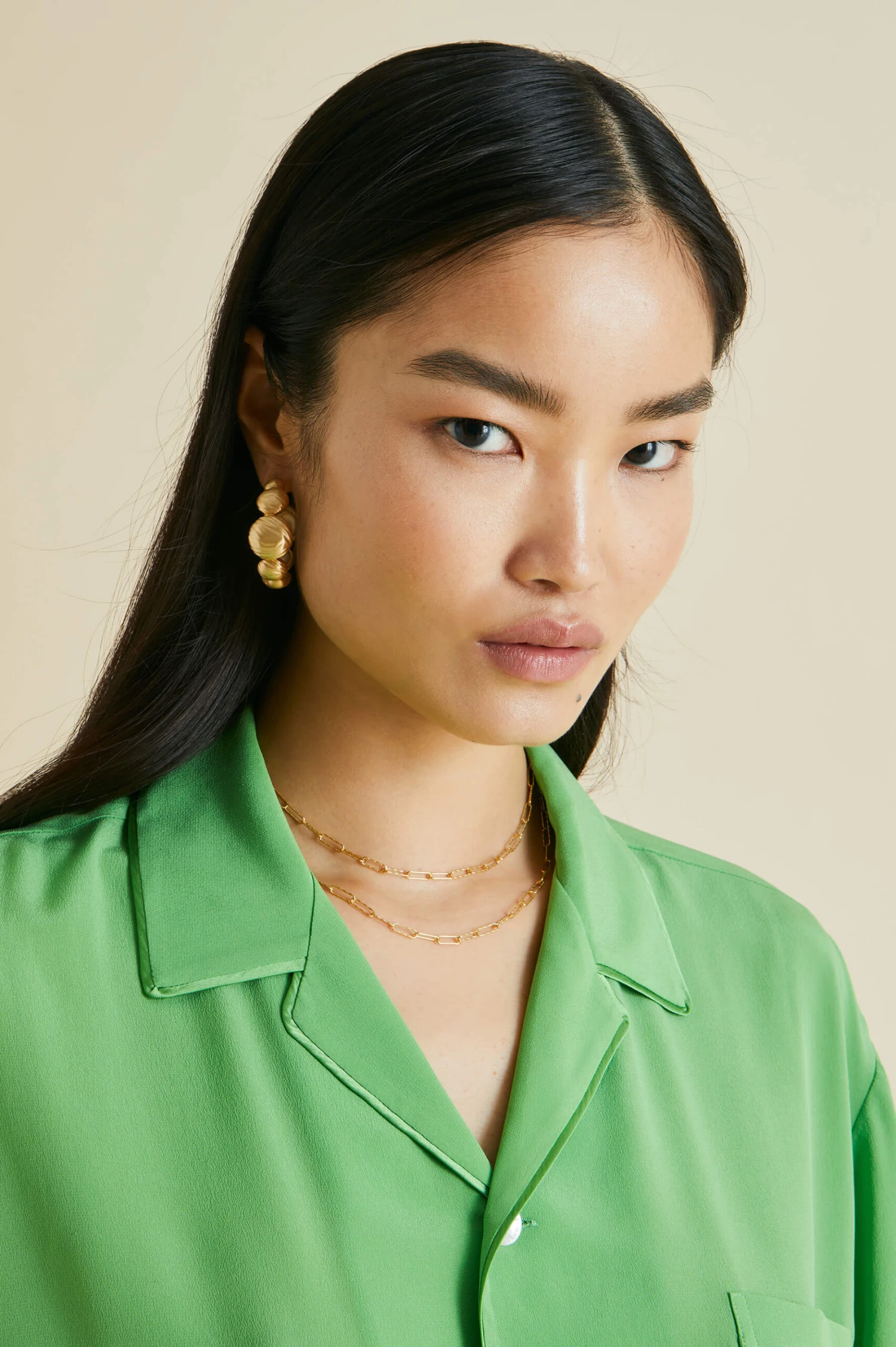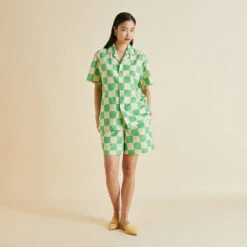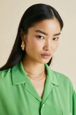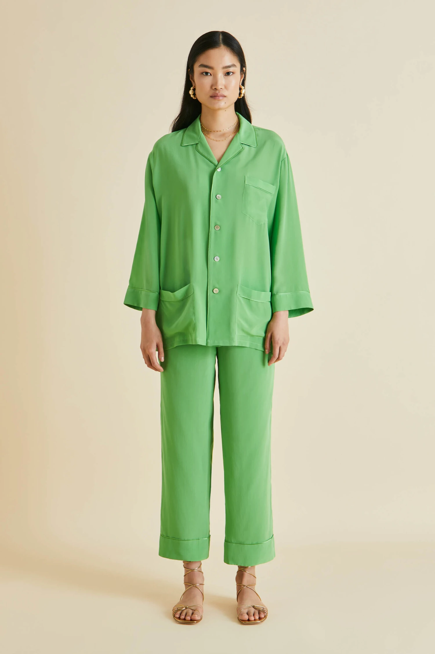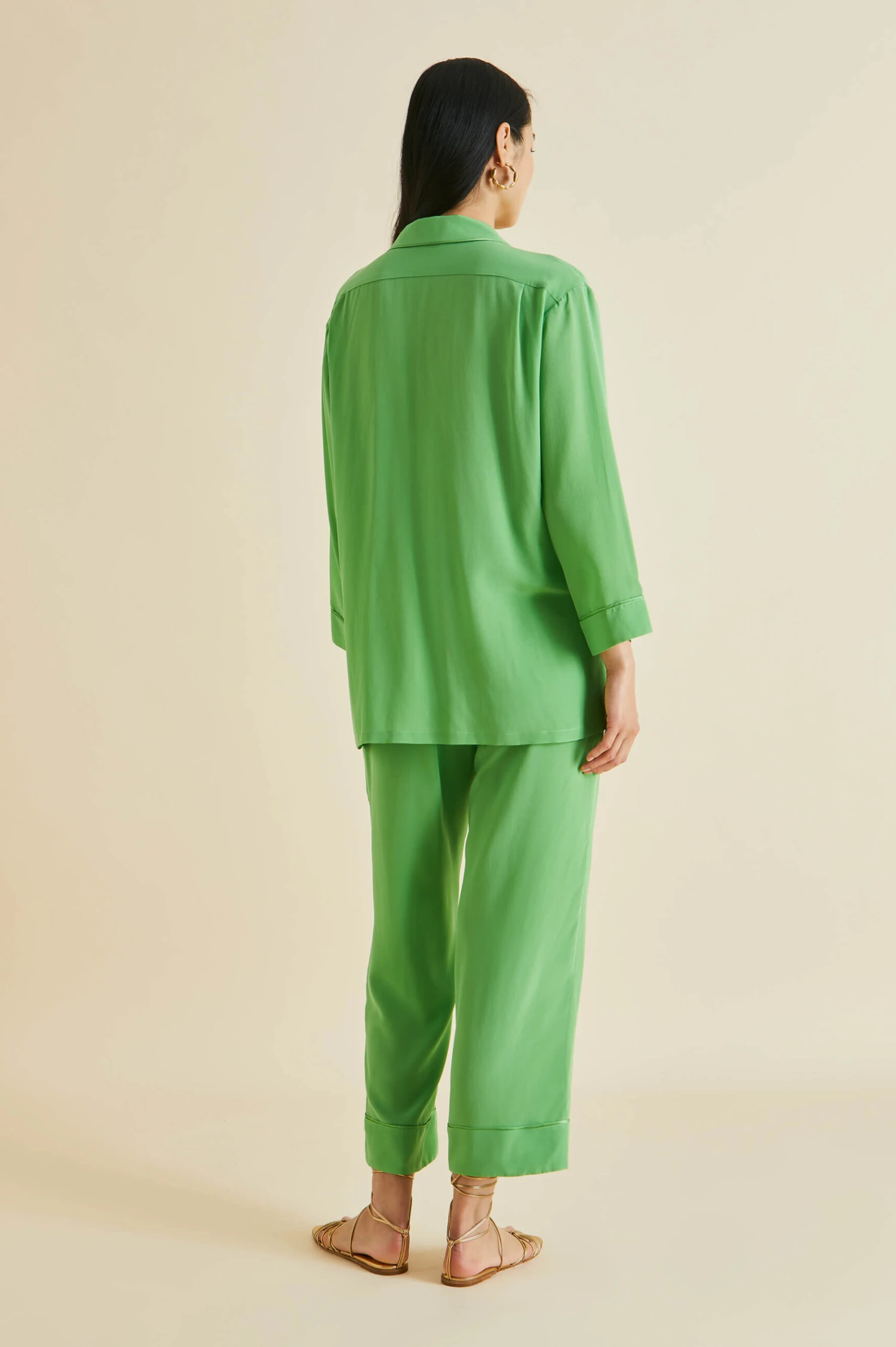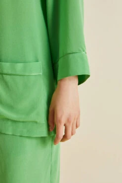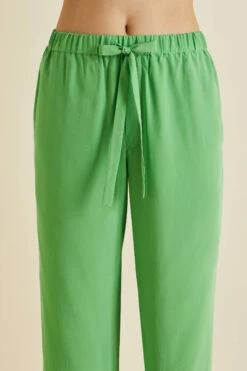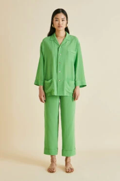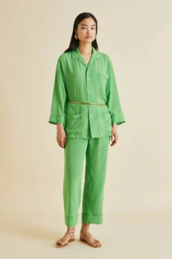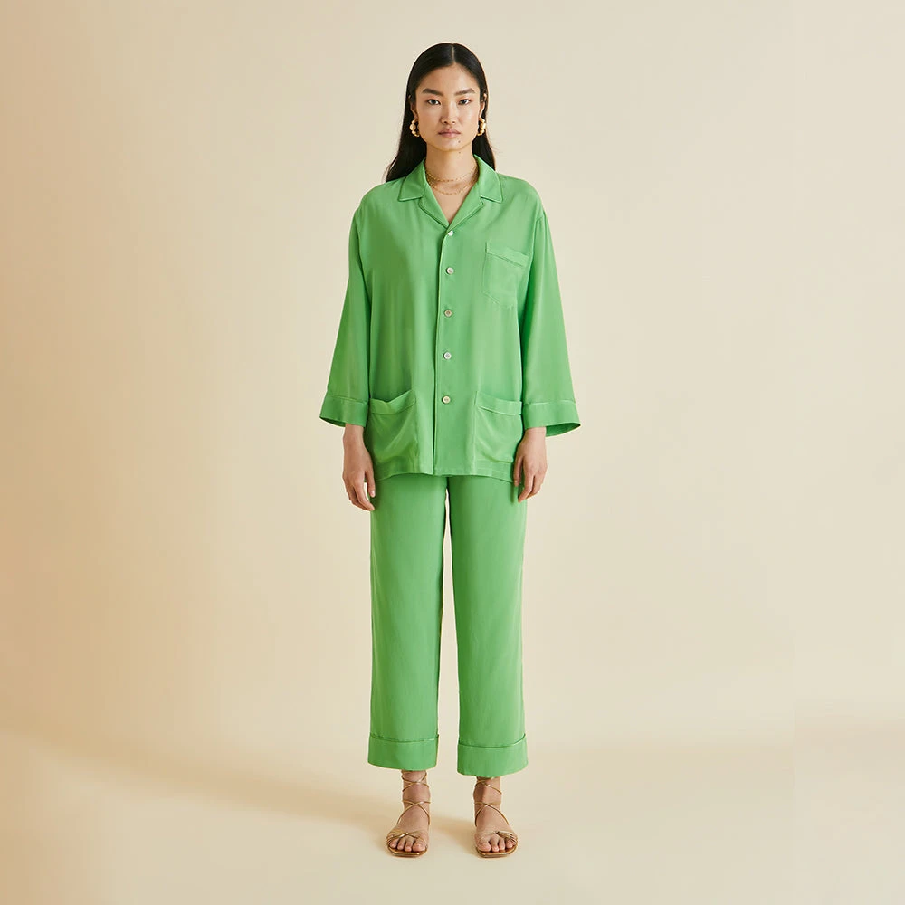 Dream of 1920s opulence in our gloriously green silk crêpe de Chine Fifi pajamas. Paying homage to the bohemian spirit of the French Riviera in the 1920s and 30s, this fresh colorway for our signature relaxed fit pajama offers a seductive lesson in truly decadent down-dressing.