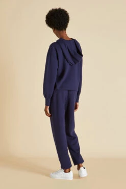 Introducing our Gia tracksuit, the ultimate chic travel piece crafted from the softest pure silk-cashmere blend in classic navy. The Gia Paris is cut in a slim silhouette with a generous hood and luxe gold draw cord details. This is the ultimate in luxury loungewear. This style and silhouette is suited to all, and does not adhere to gender boundaries.