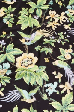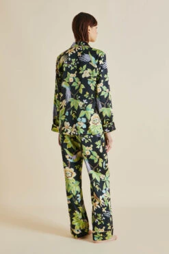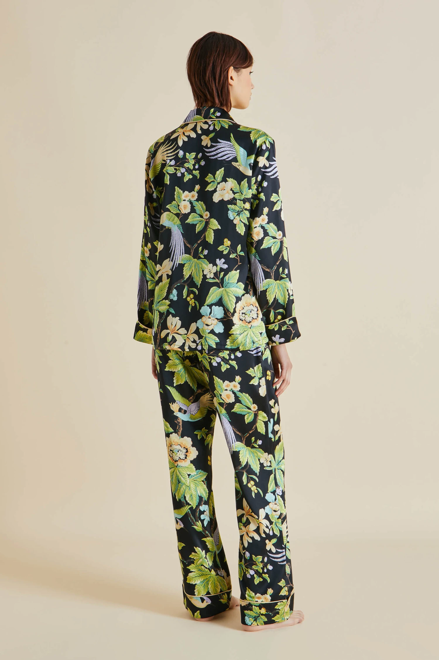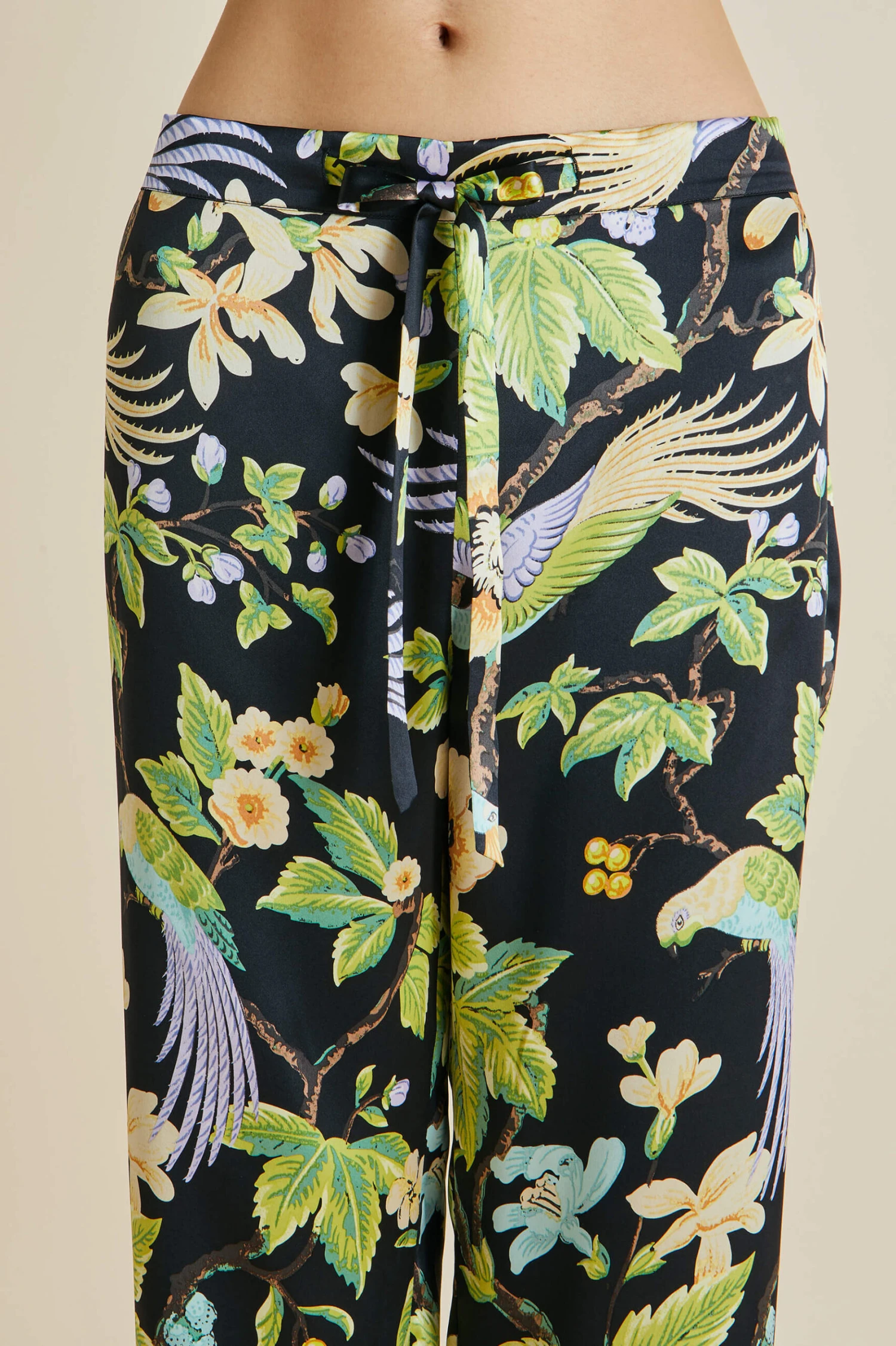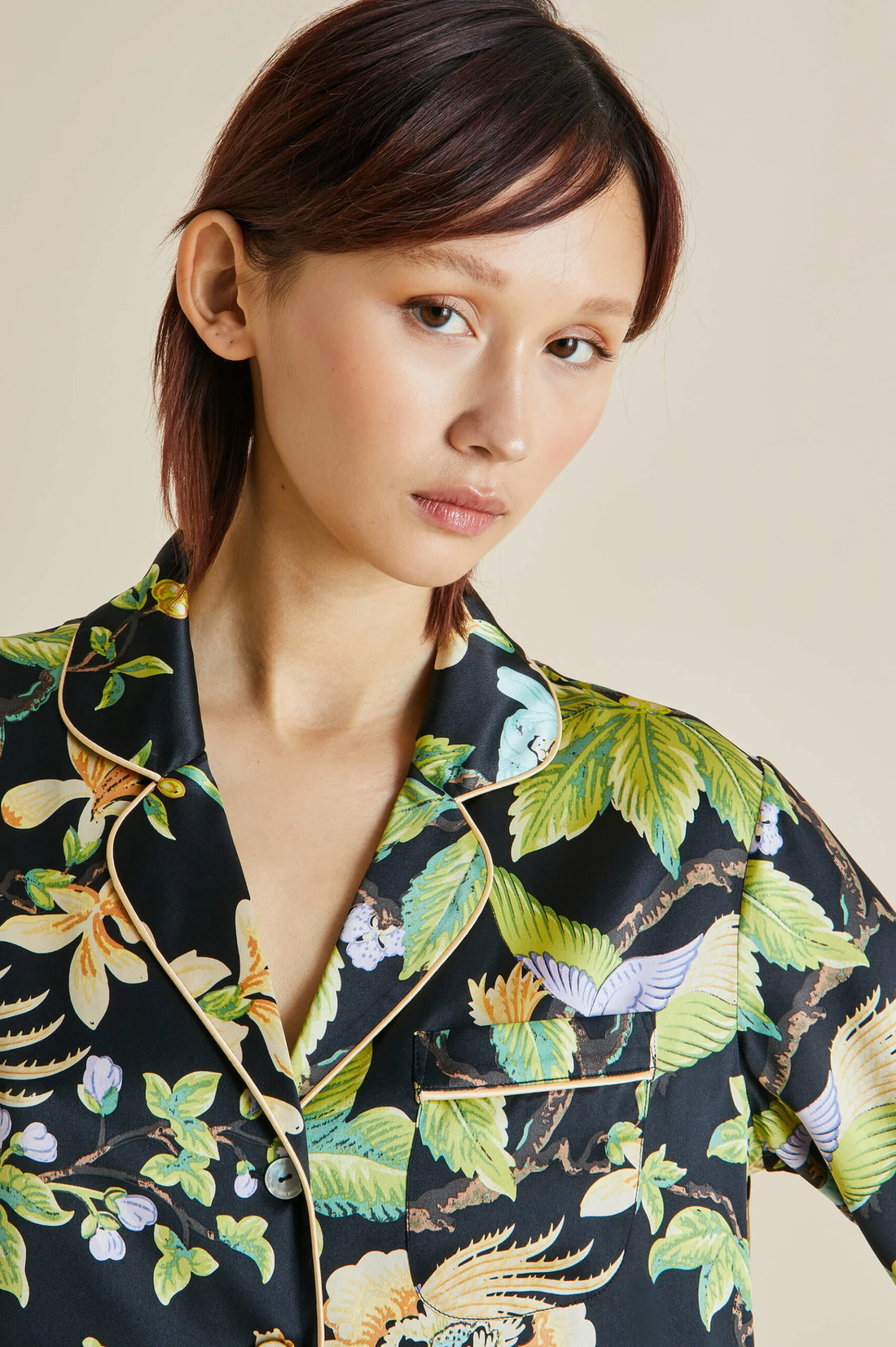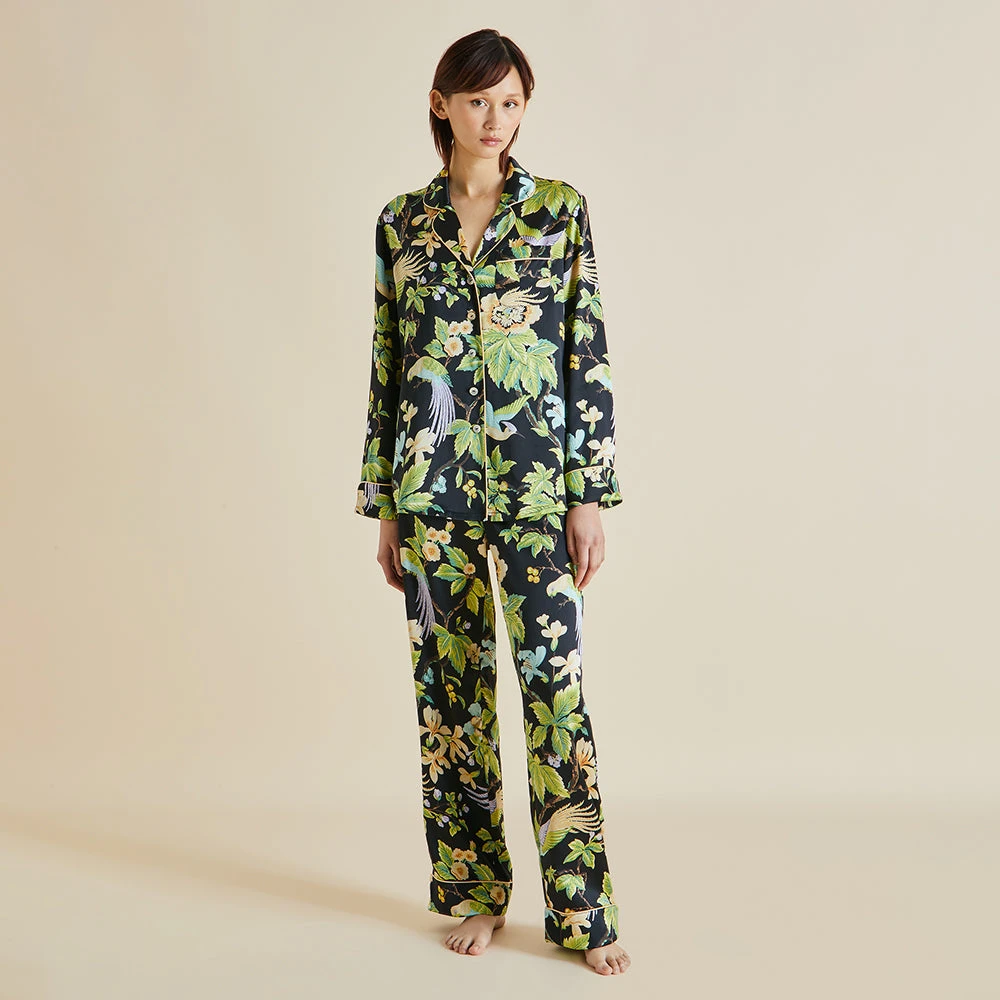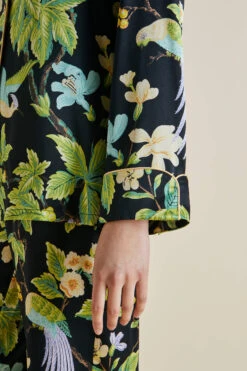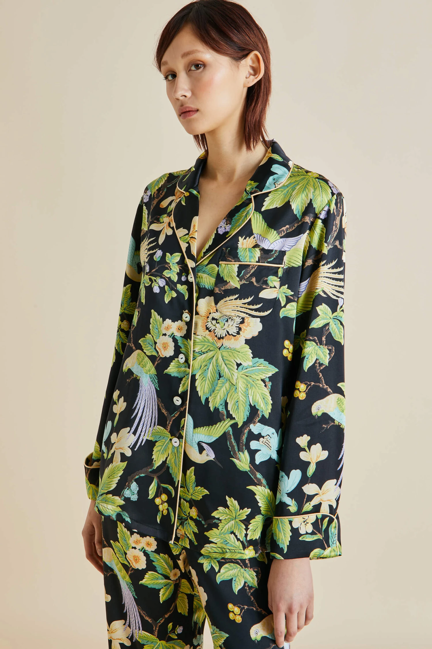 Looking towards the lush greenery of the rainforest, this season the Lila silk pajama pays homage to travel at its most romantic and nature at its most extravagant. Vivid birds flit across jet black 19-momme silk while tropical flowers bloom, this opulent pattern offset by gleaming mother of pearl buttons.
