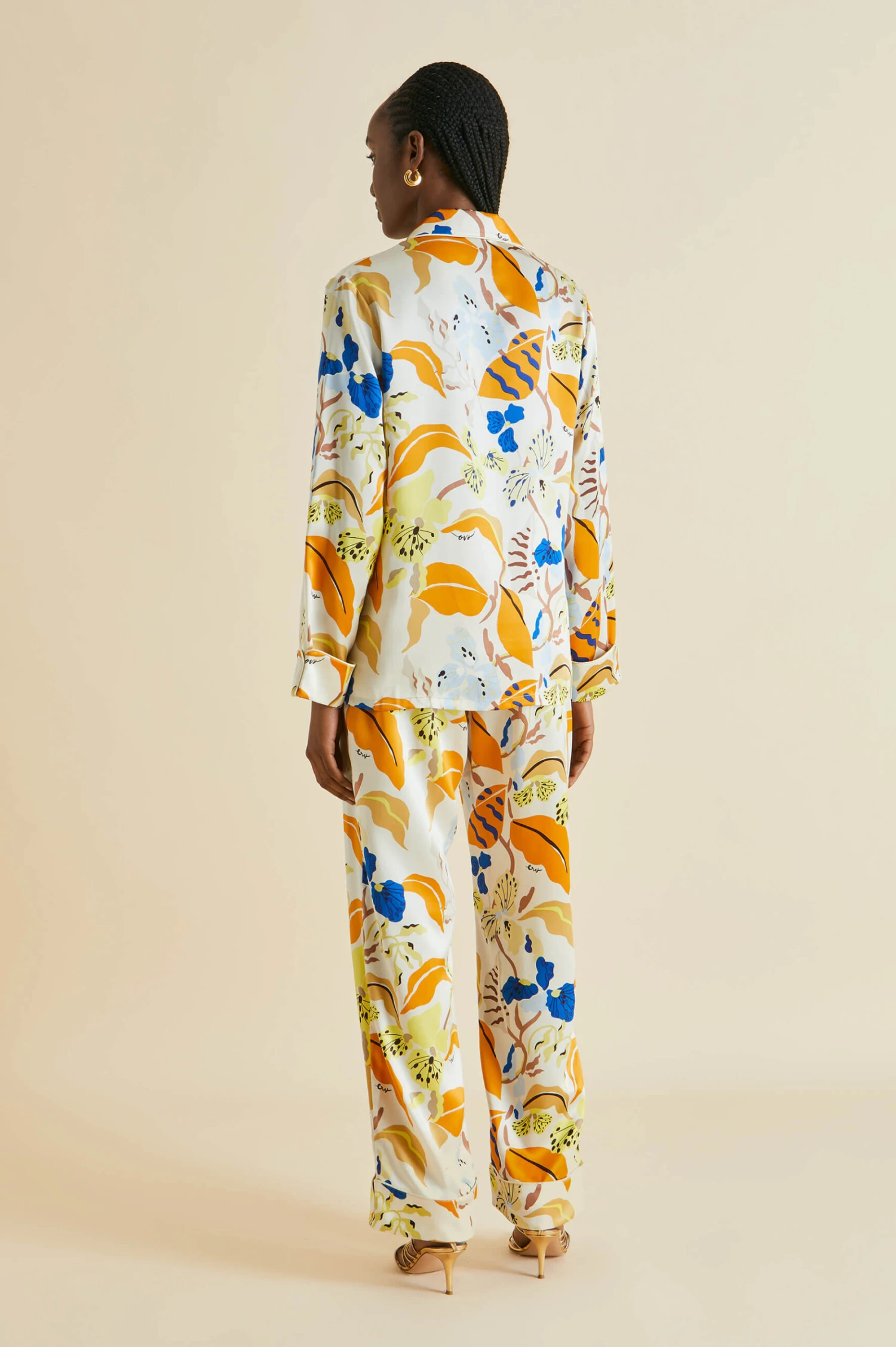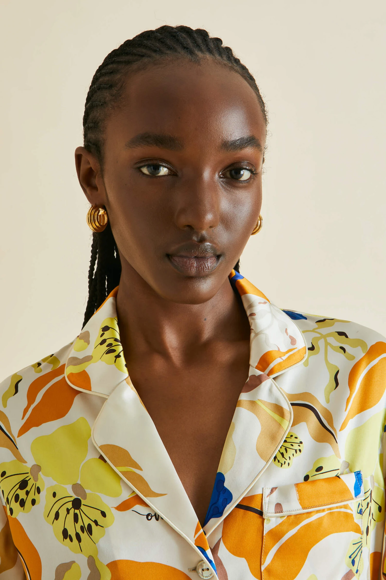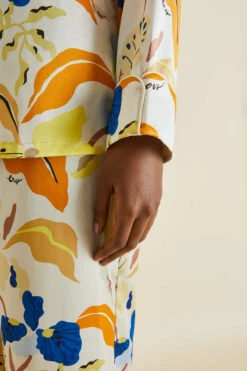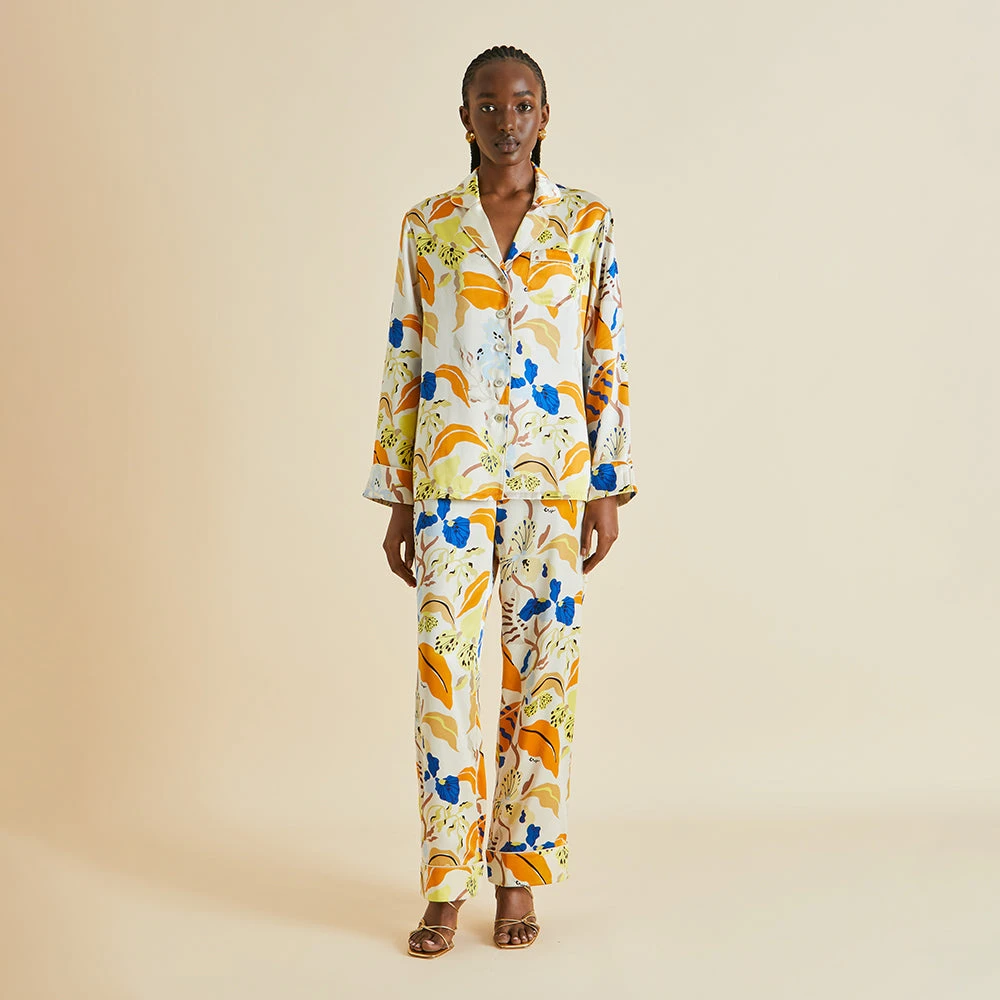 Inspired by the bold colors and visionary lines of artists including Sonia Delaunay, Jean Cocteau and Pablo Picasso, this season our signature Lila pajama comes clad in abstracted florals. With her classic piped silk trims, she’s as striking as a painting.