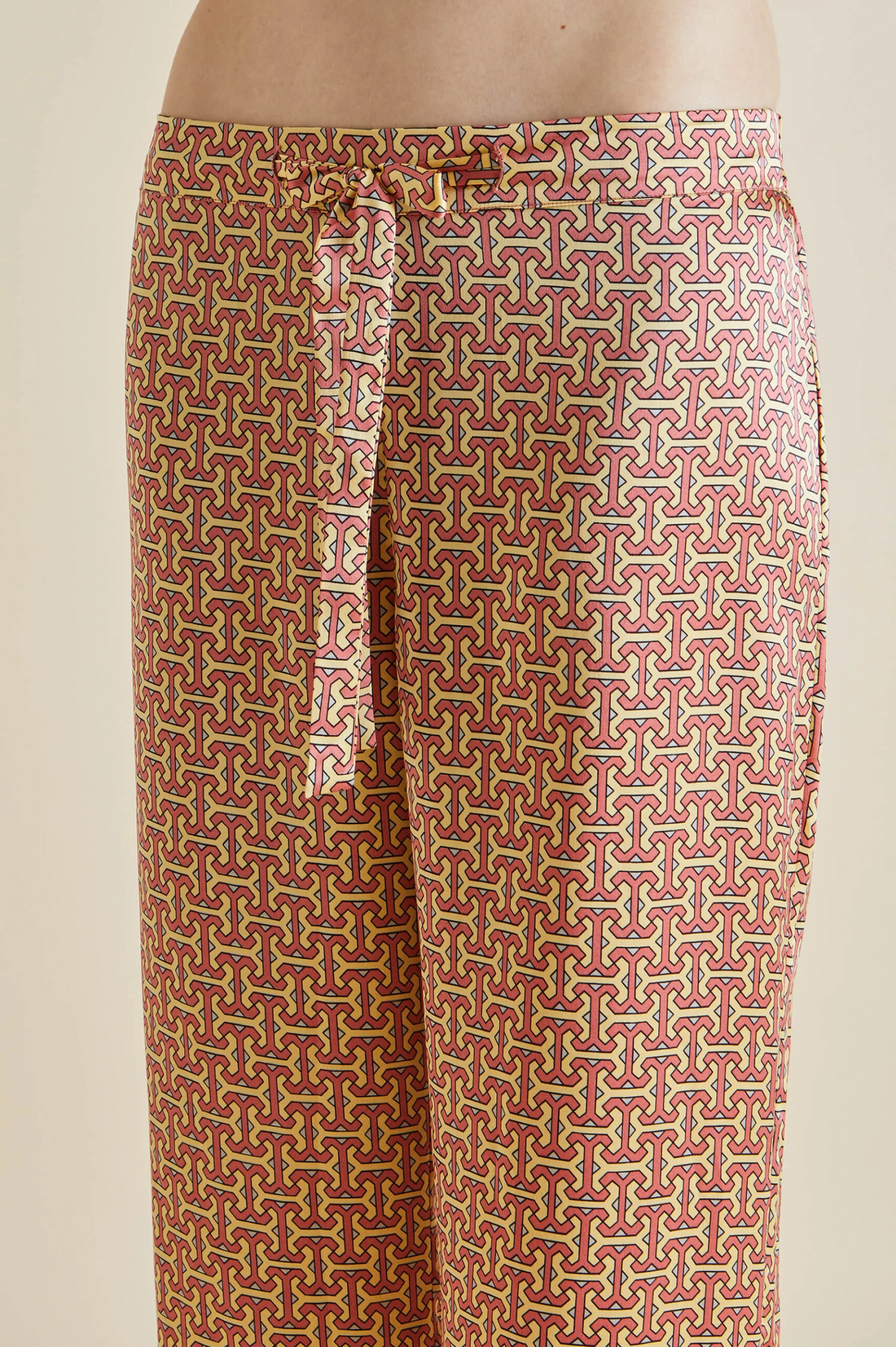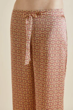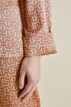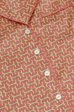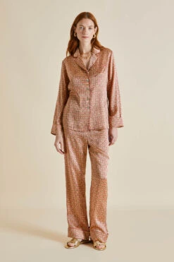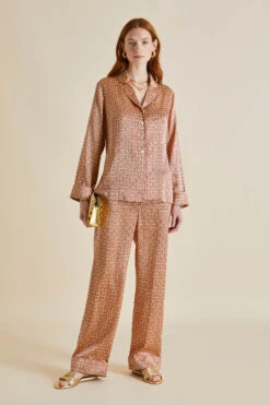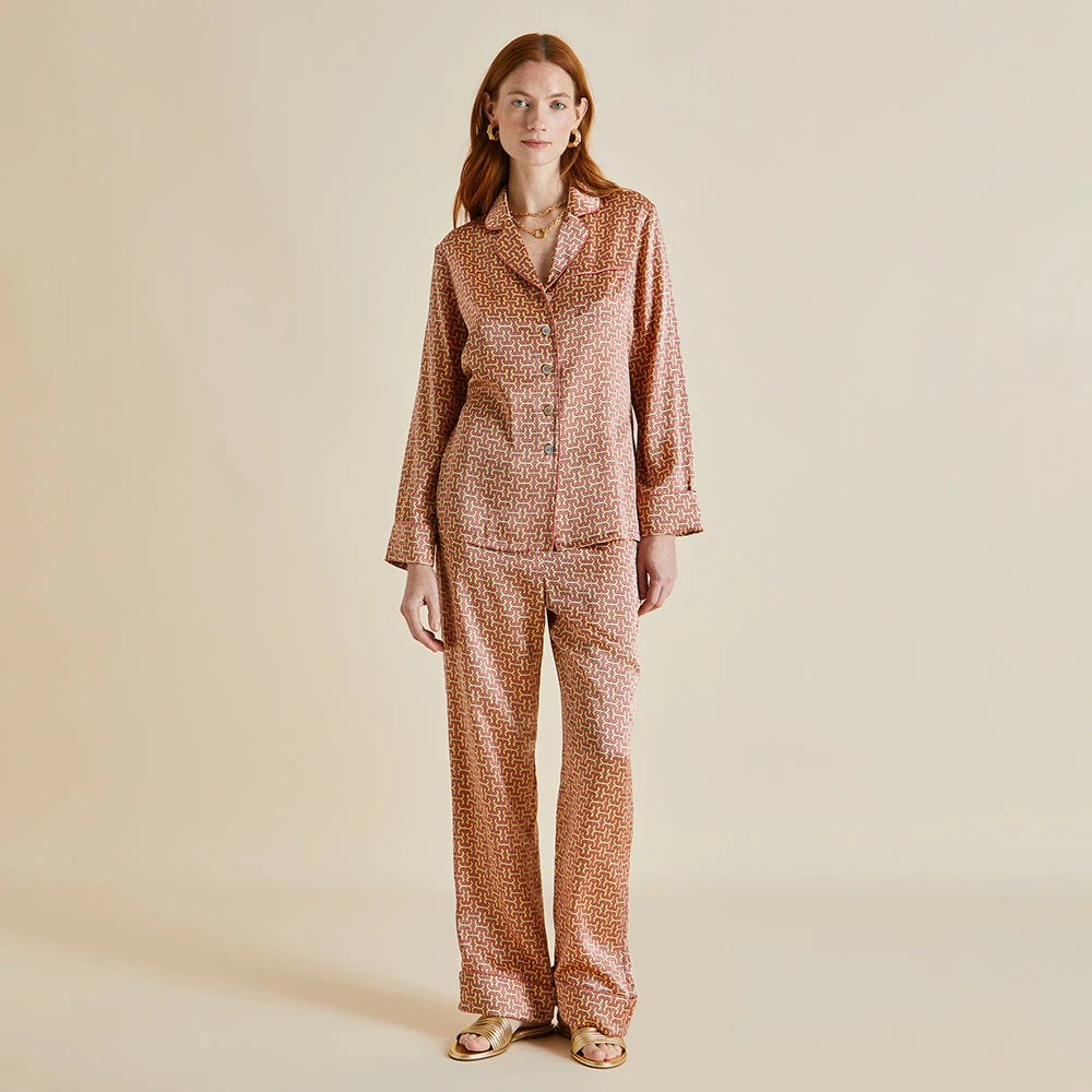 Our much-loved Lila silk pajama takes a tropical trip this season, packing her bags for an adventurous journey by train. Her small, pleasingly intricate geometric print nods to the early days of Olivia von Halle, but this 19-momme silk beauty with a rose piped trim has her eyes set firmly on the horizon.
