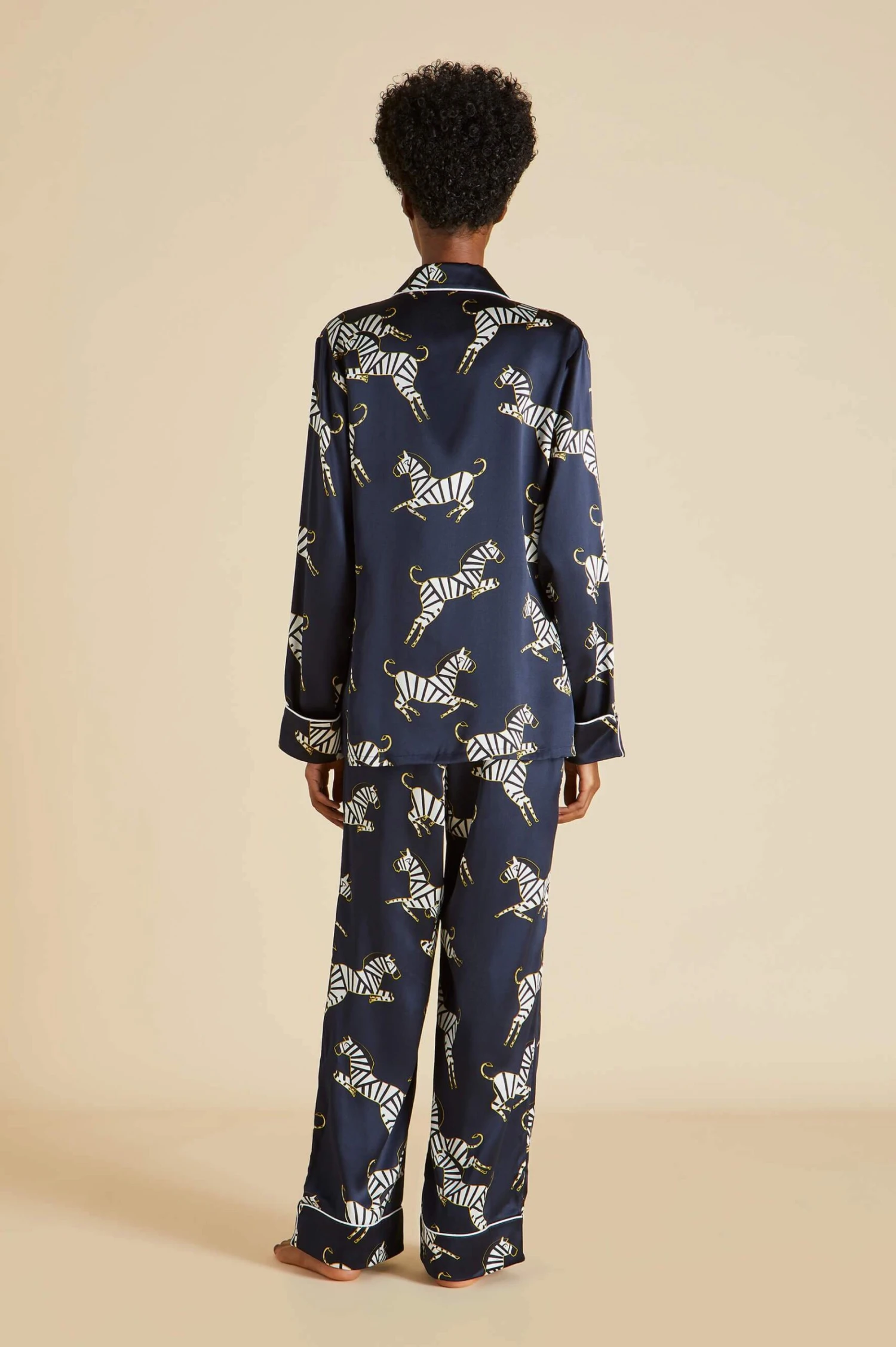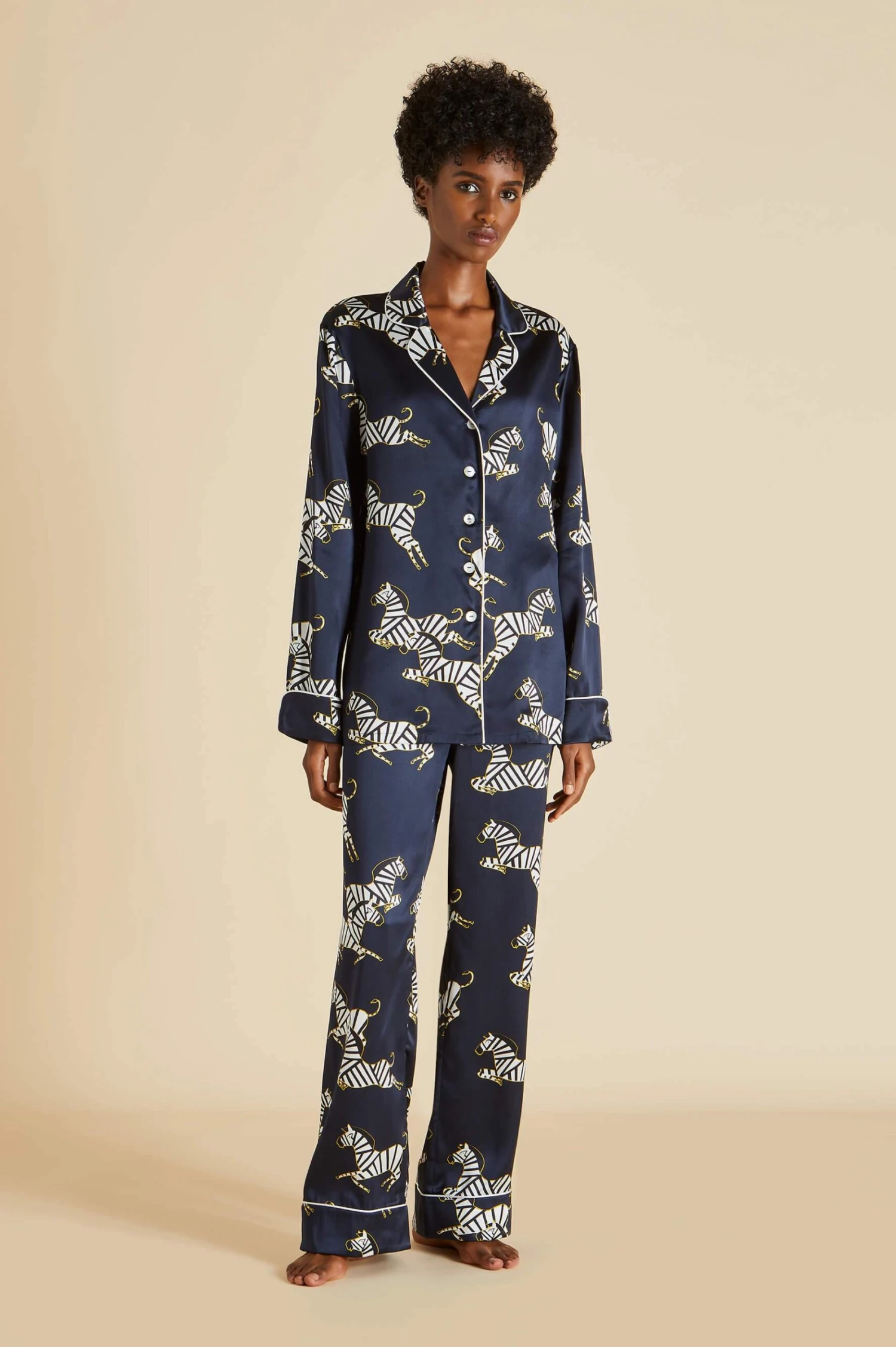 As playful as the name suggests, the Lila Zizi embodies the glamorous appeal of life in Olivia von Halle. This bestselling print silk pajama set is the silk pajama set to rule them all; in the finest silk, crafted using our statement screen-printing method, explore a new realm of luxury with this luxurious silk pajama set.