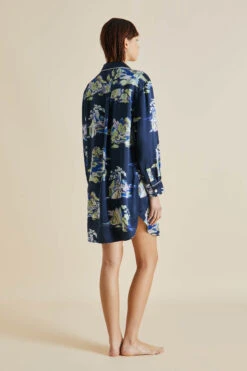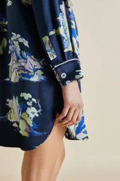 Arriving fresh from her holidays, our relaxed Poppy nightshirt brings with her the crisp freedom of high-altitude adventuring. Designed in-house at our London atelier, this luxurious screen-printed mountainscape pattern adorns our signature soft-as-air 19-momme silk – its clouds and treetops accented by gleaming mother of pearl buttons.