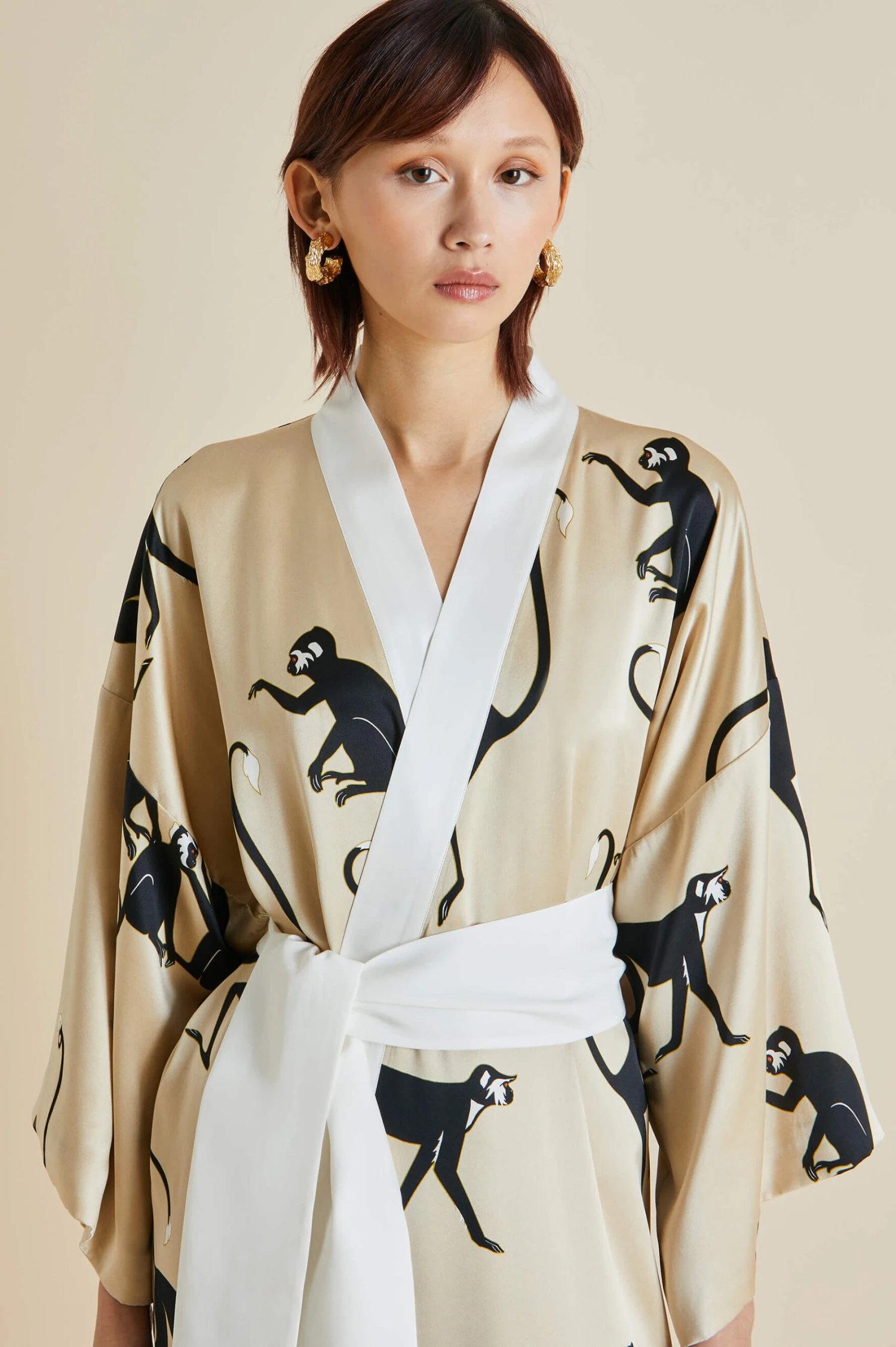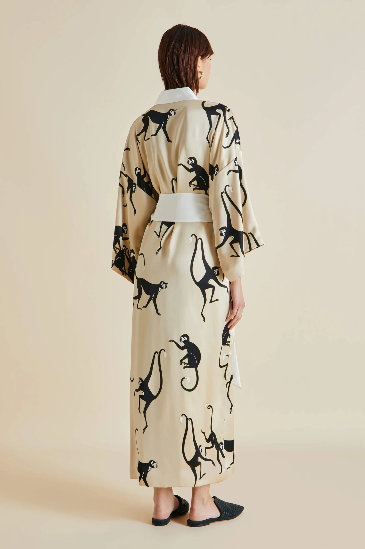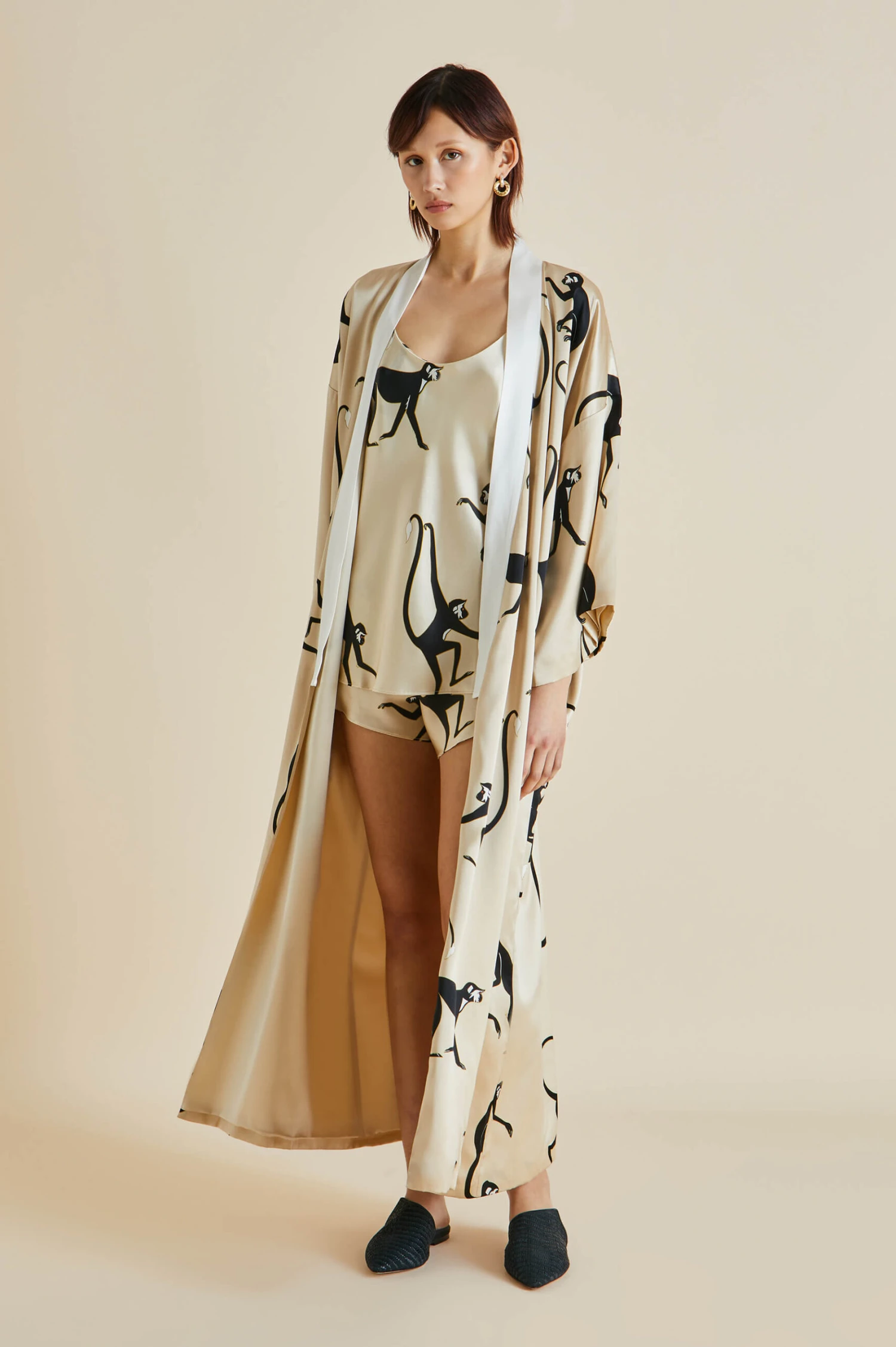 Survey the jungle in style in our 19-momme silk Queenie robe, adorned this season with our elegant-but-mischievous monkey screen-print. Part of the Spring Summer collection exploring the thrills and lost romance of travel, this full-length kimono style robe ensures youโll always make a majestic impression.