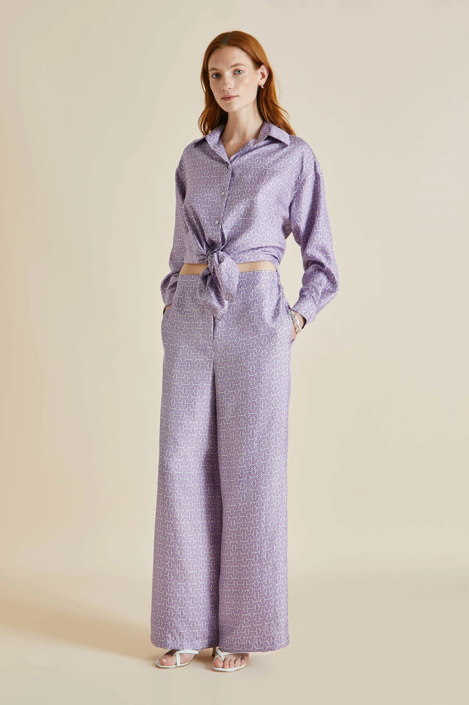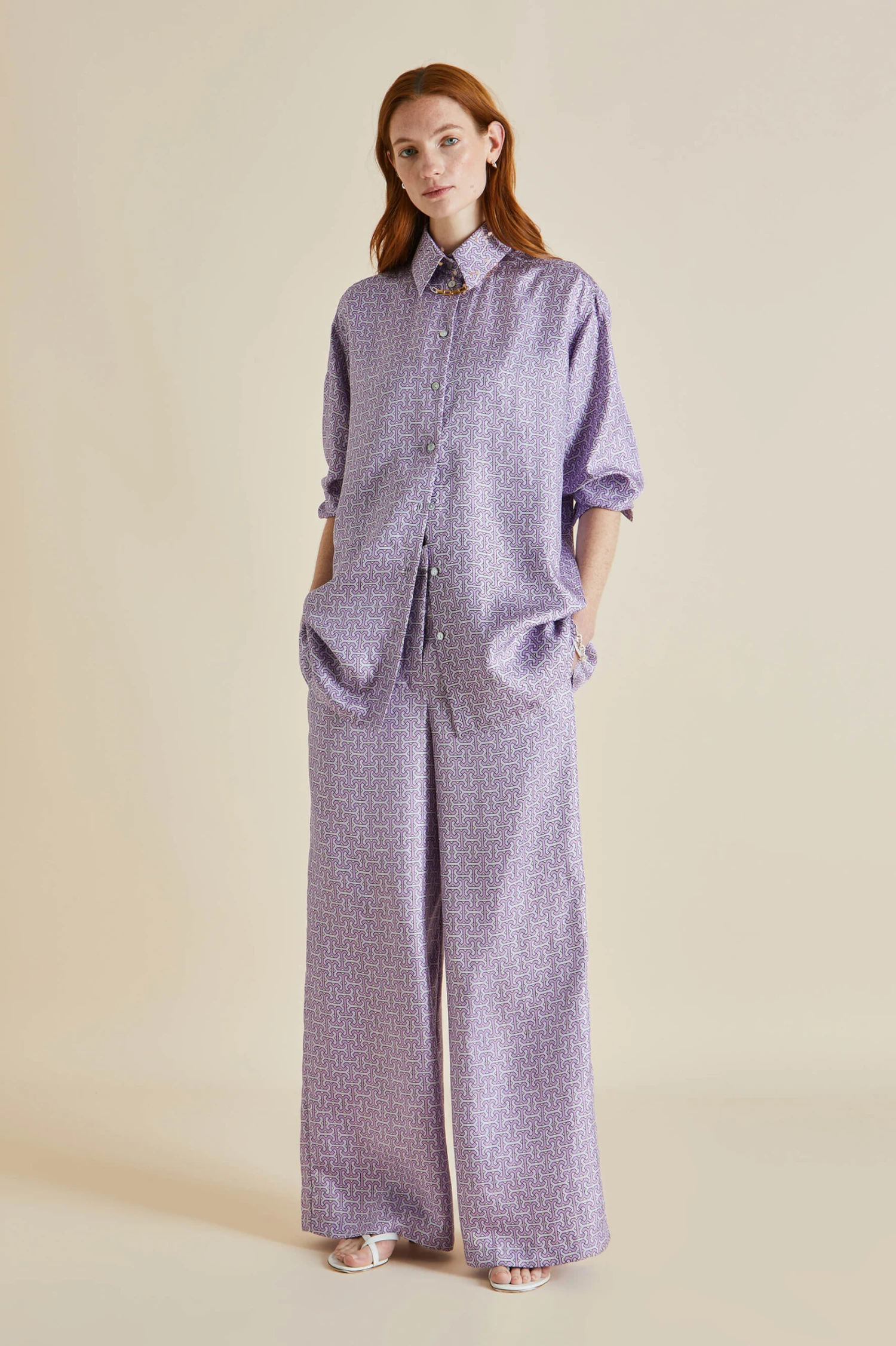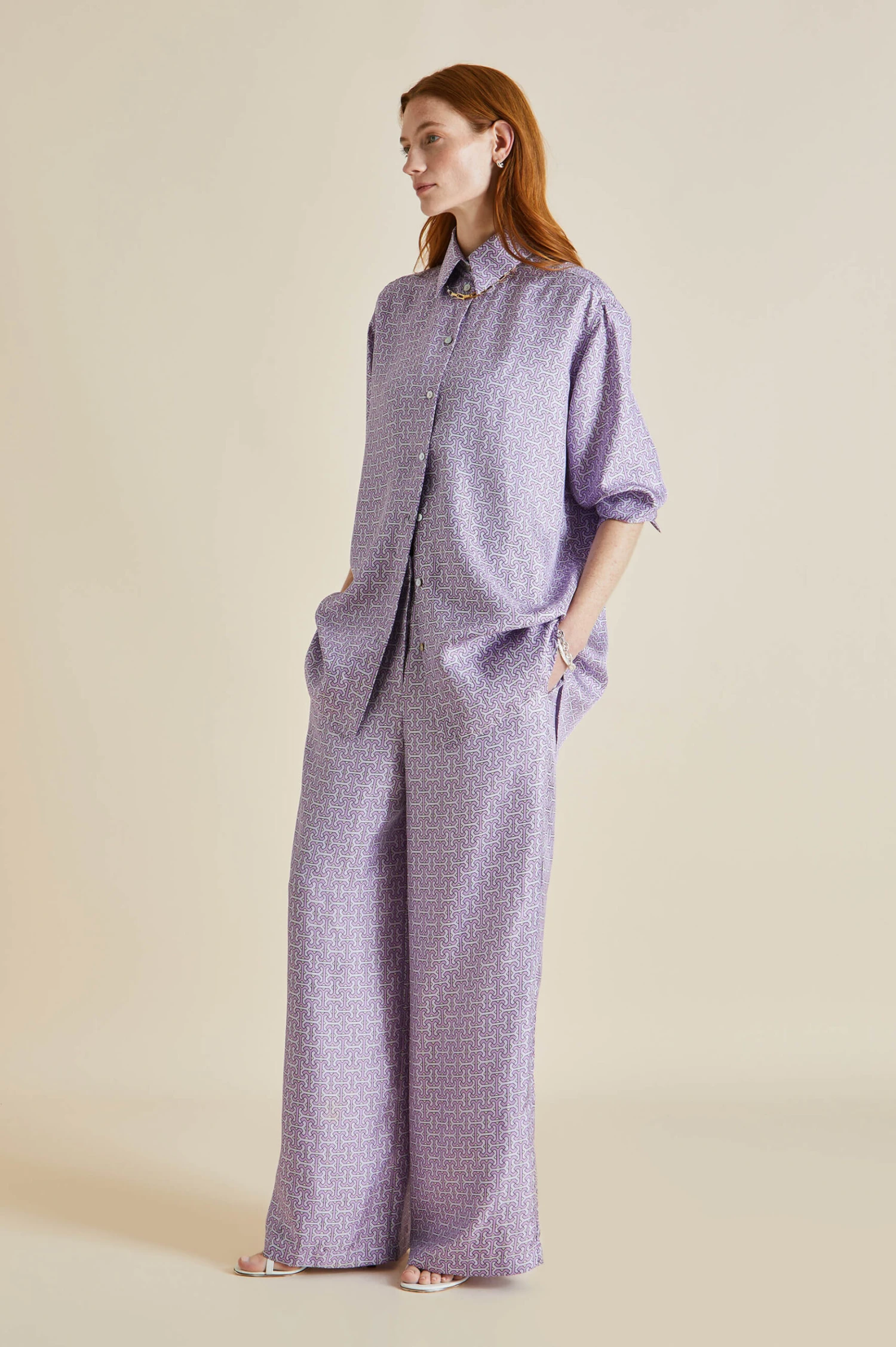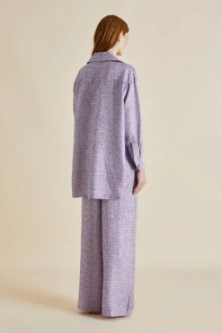 Look to the horizon in our stunning new Wolfe silk pajama set. Inspired by groundbreaking interiors designer Elsie de Wolfe, it retains all of her glamour and feminine charm. This silk-twill set was made to be worn in places of great beauty, her relaxed silk-twill shirt and palazzo trousers equally at home in a buzzing restaurant or amongst the quiet splendour of the perfectly arranged living room.