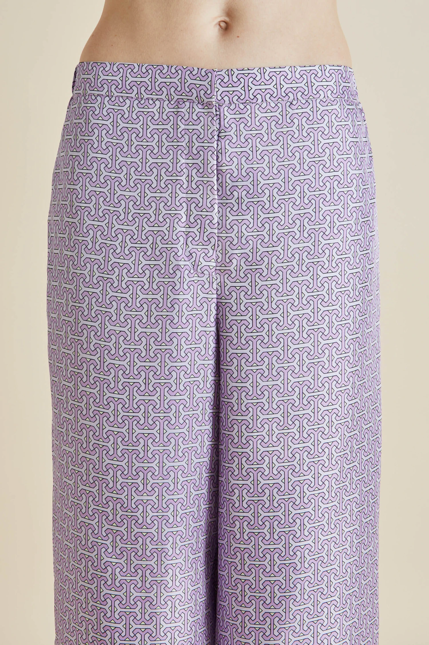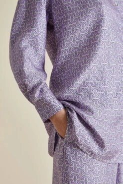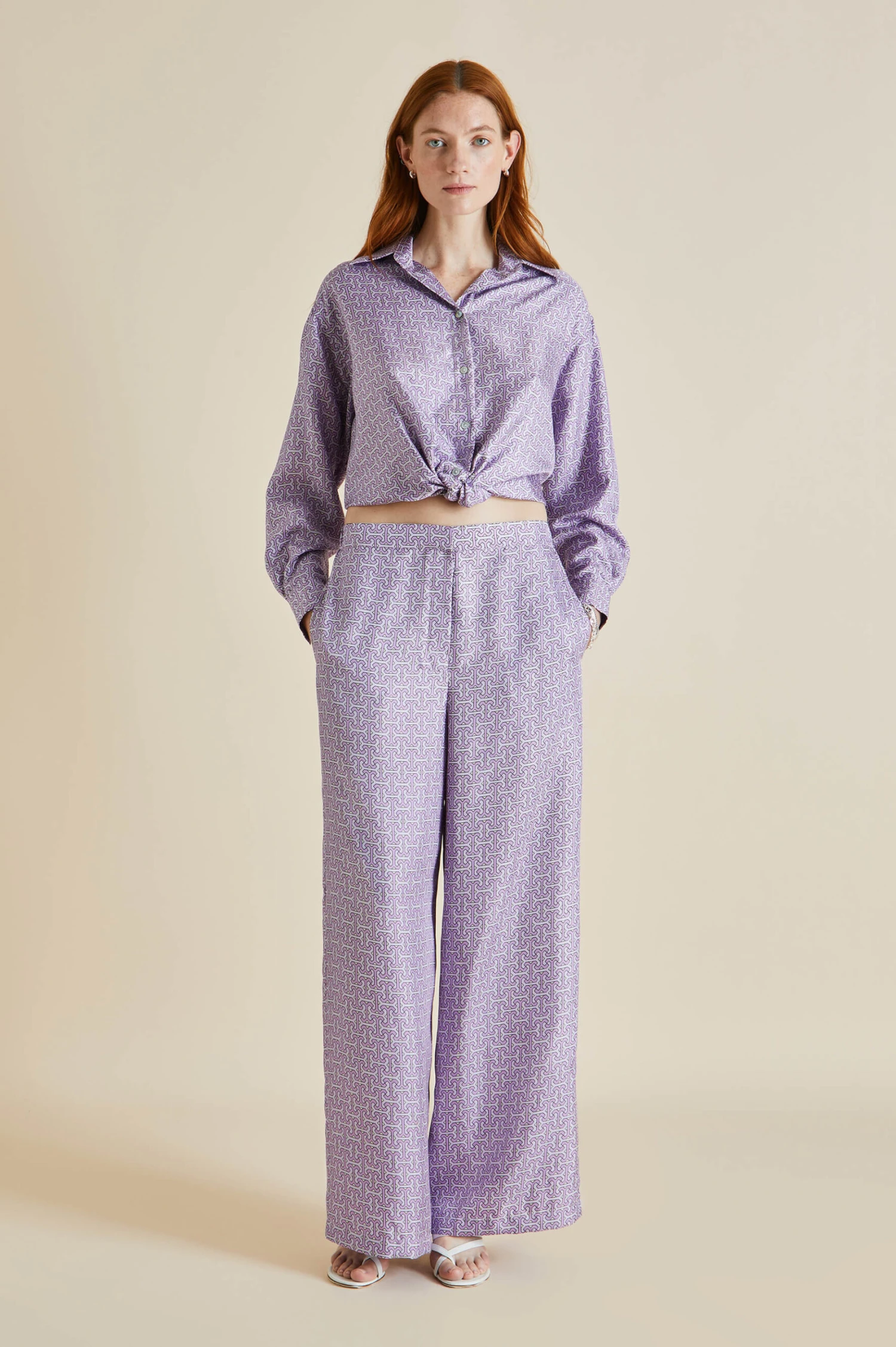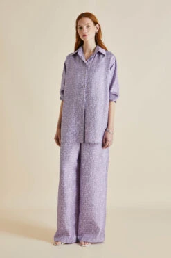 Look to the horizon in our stunning new Wolfe silk pajama set. Inspired by groundbreaking interiors designer Elsie de Wolfe, it retains all of her glamour and feminine charm. This silk-twill set was made to be worn in places of great beauty, her relaxed silk-twill shirt and palazzo trousers equally at home in a buzzing restaurant or amongst the quiet splendour of the perfectly arranged living room.