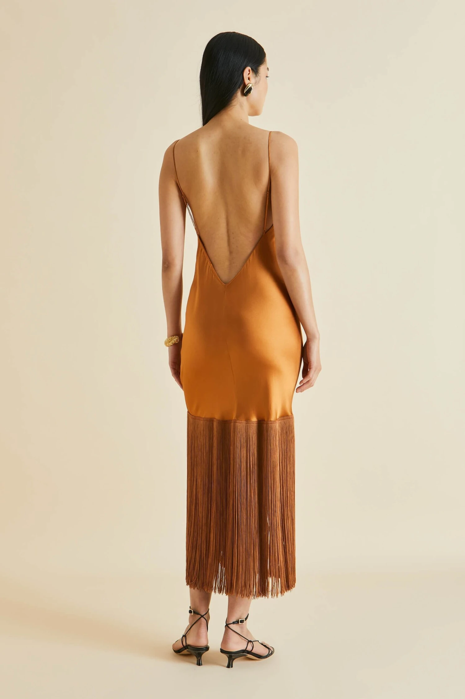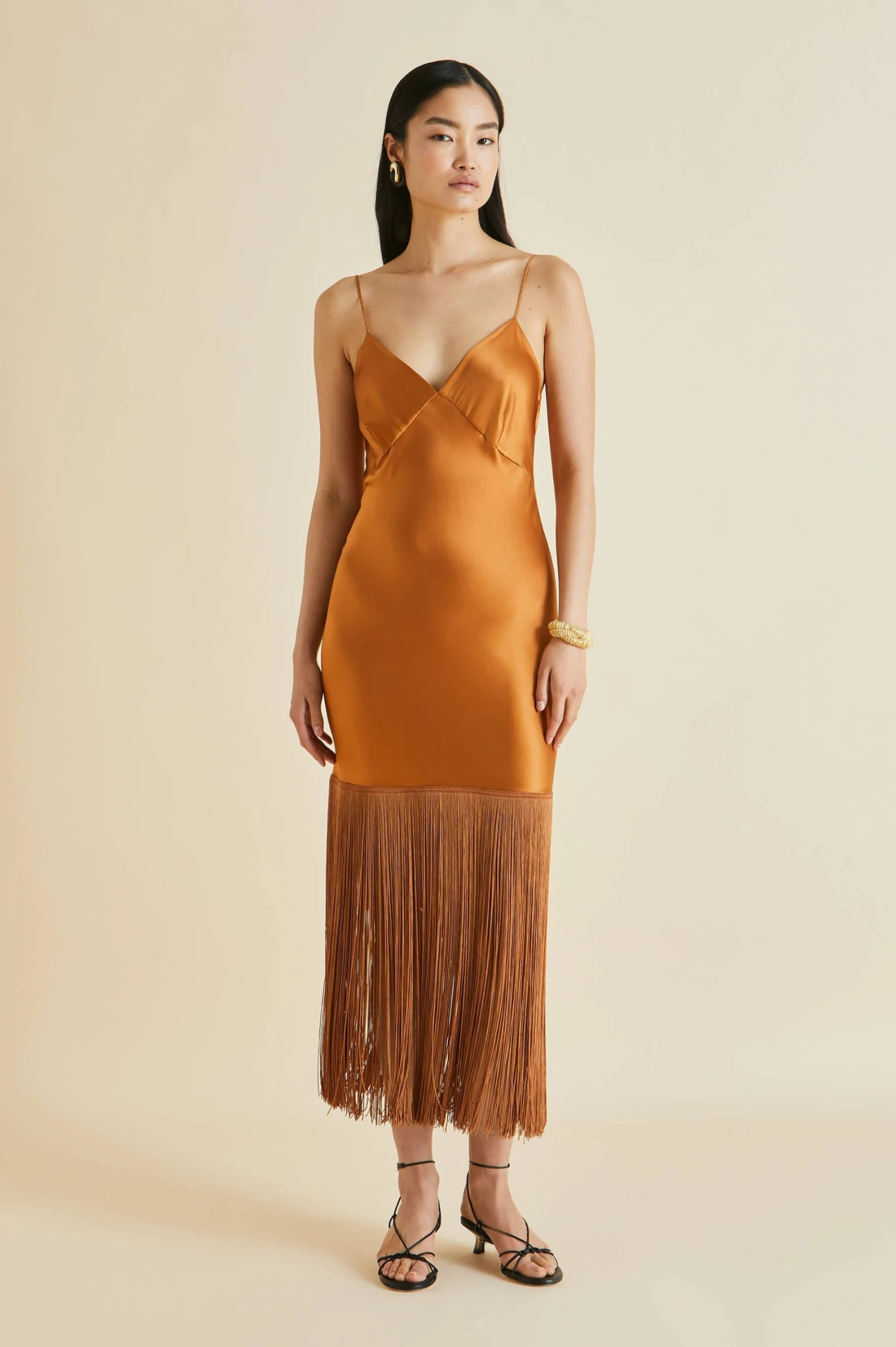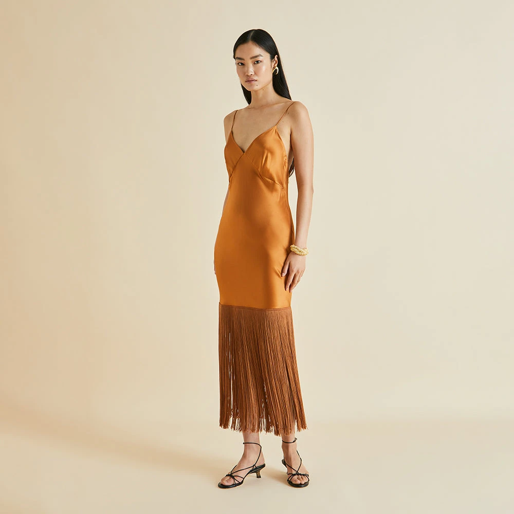 Embrace the splendor of constant motion in our bronze Zoya slip. Inspired by the sun, sea and free-spirited bohemianism of the French Riviera in the 1920s and 30s, in our fringed 19-momme silk dress you’ll be everyone’s muse.