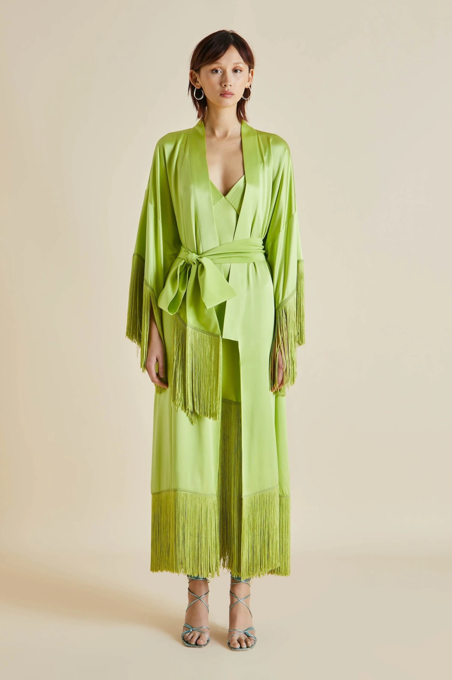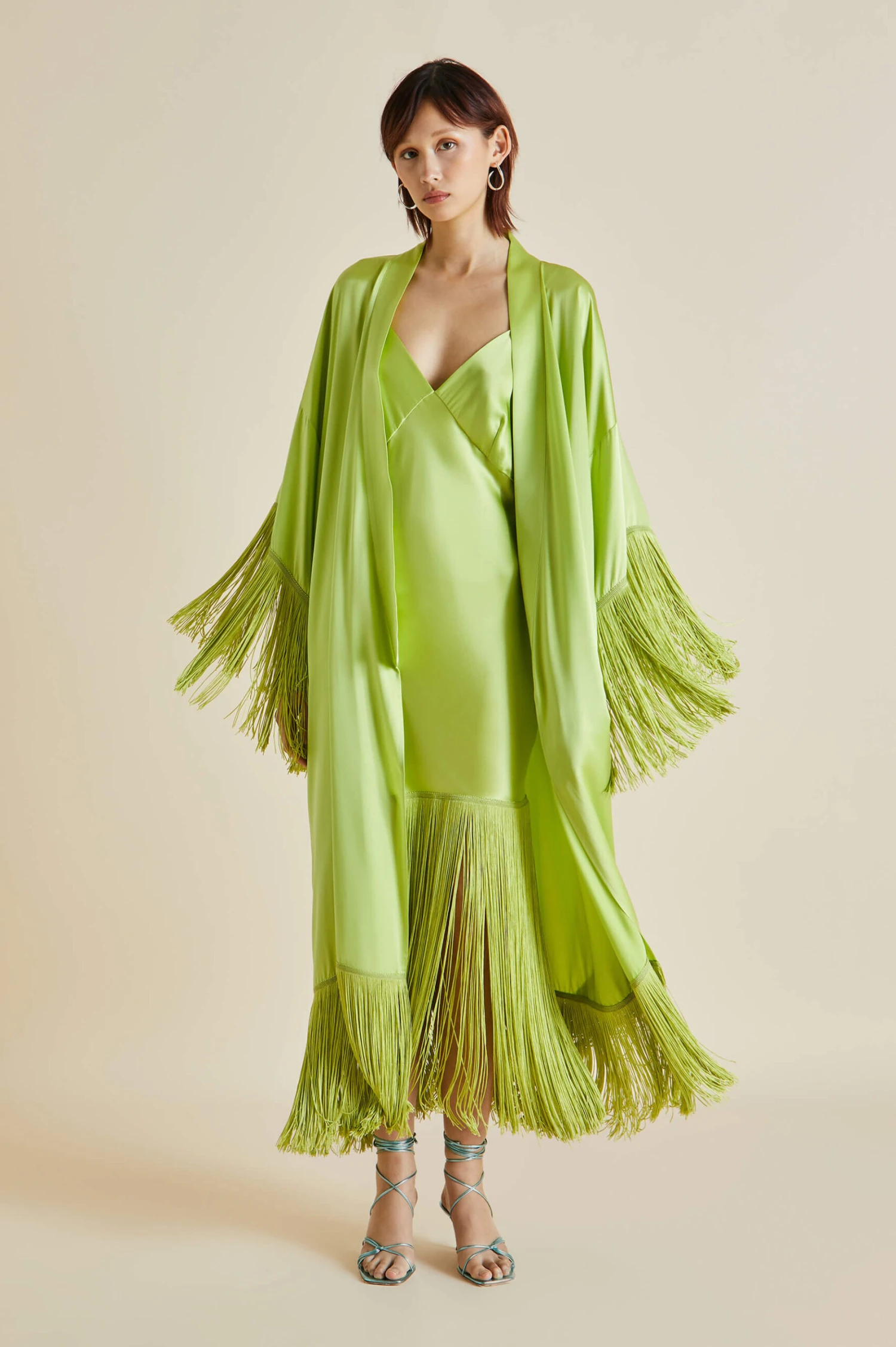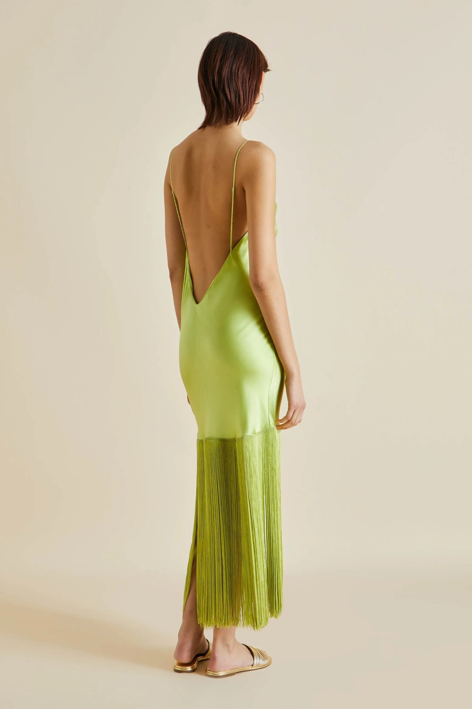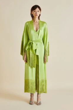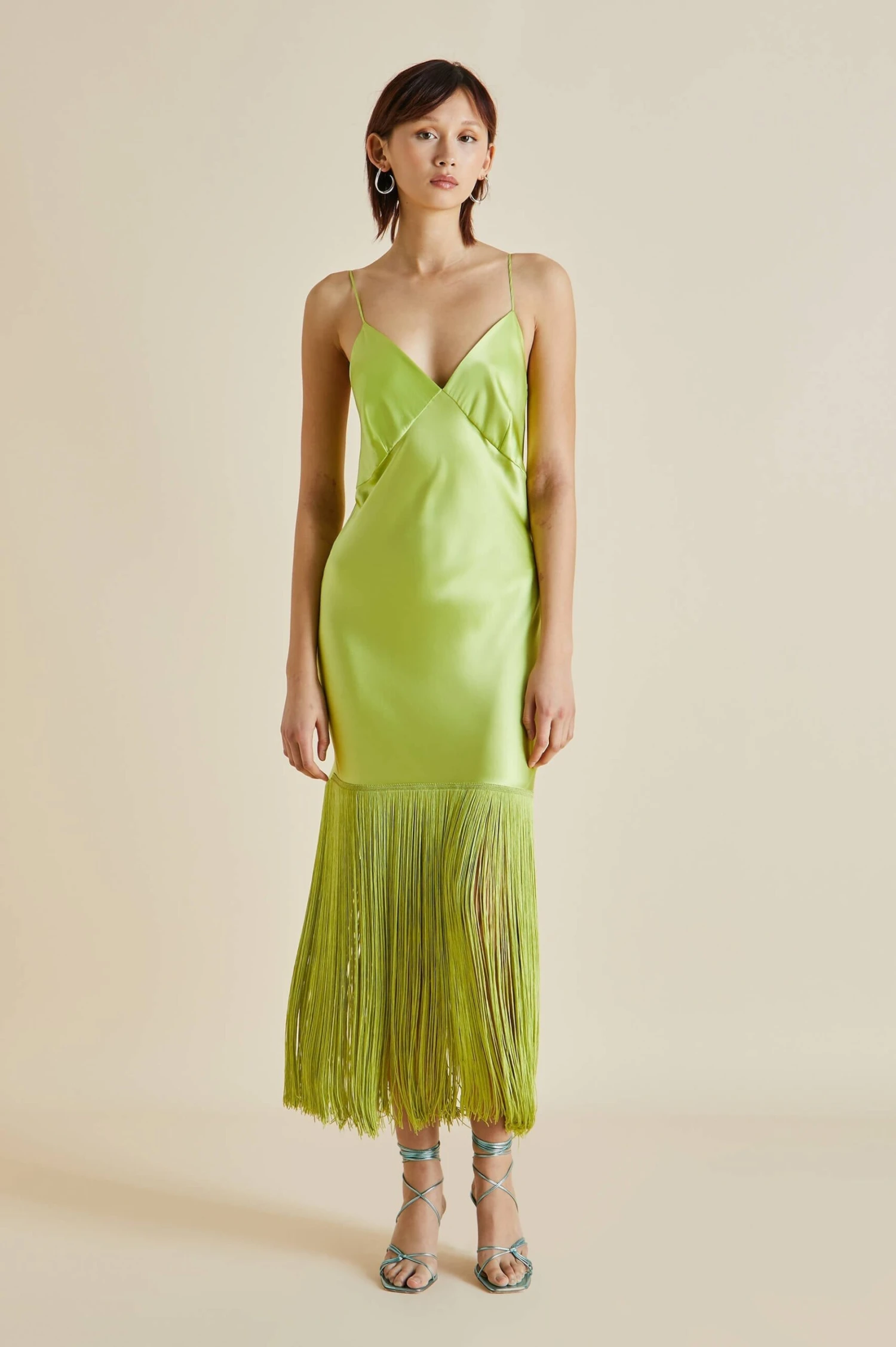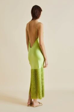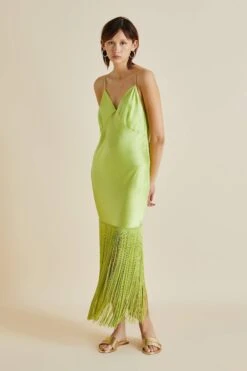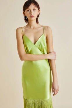 Shimmy into the Zoya, our sublime new design trimmed with delicate fringing. Offering a fresh twist on our tried-and-true slip dresses, she’s the ideal addition to any wardrobe. Embrace your inner bird of paradise in sumptuous palm 19-momme silk, a cascade of rayon fringing adding an exquisite shiver of motion.