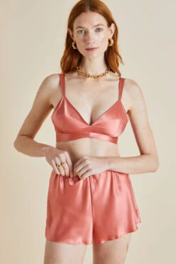 Our celebrity favourite silk bralette and short set returns this season spun from blushing rose 19-momme silk. Like her namesake, the Zsa Zsa is a glamorous creature: extravagant, unabashed, slightly tongue-in-cheek. Pair her with the Mimi rose robe for a truly opulent experience.