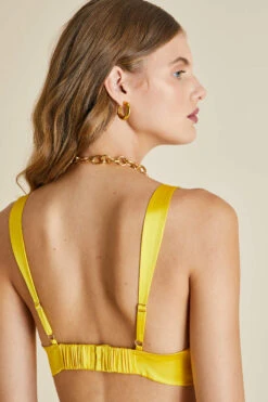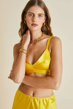 Brand-new to the Olivia von Halle line-up โ but expected to be a crowd favourite รข ร is the 100% silk Zsa Zsa bralette-and-French-knicker set. Rendered in our most splendid Saffron hue for Resort 2023, sheโs dazzling enough to brighten up downcast days of her own accord โ but equally adores being coupled with a nightshirt and matching merino-wool slipper when the winter chill draws in.